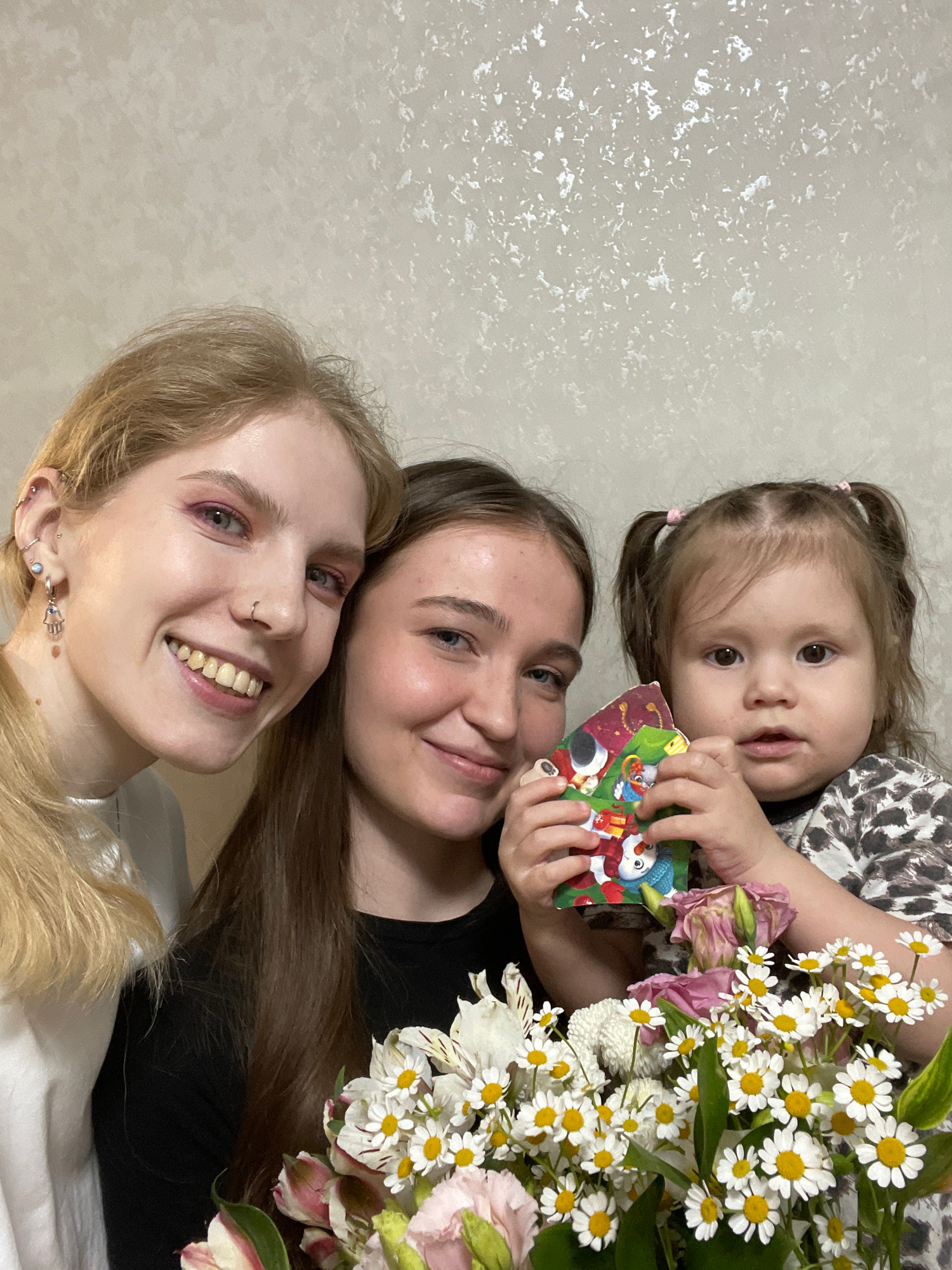 Three people are posing for a photo with a bouquet of flowers. At the top of the image is a young child, holding a small book with cartoon characters on it. Below the child is a young adult woman with…read more
