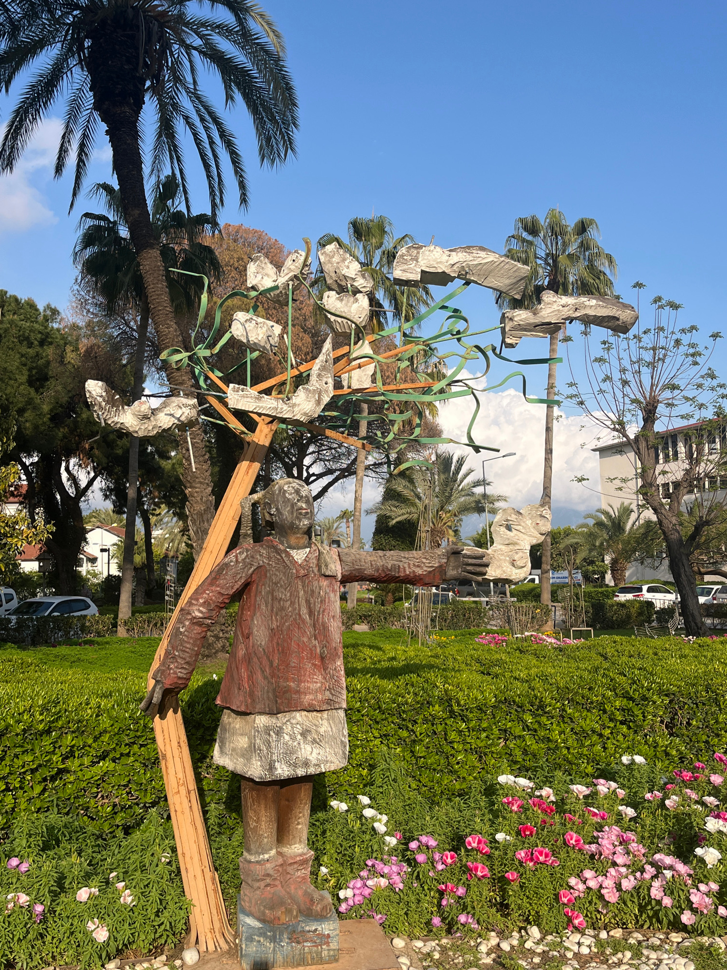 The image shows a wooden sculpture in a park-like setting, likely located in Alanya, Turkey. The sculpture appears to depict a person carrying a load, possibly a yoke, from which several white, abstra…read more