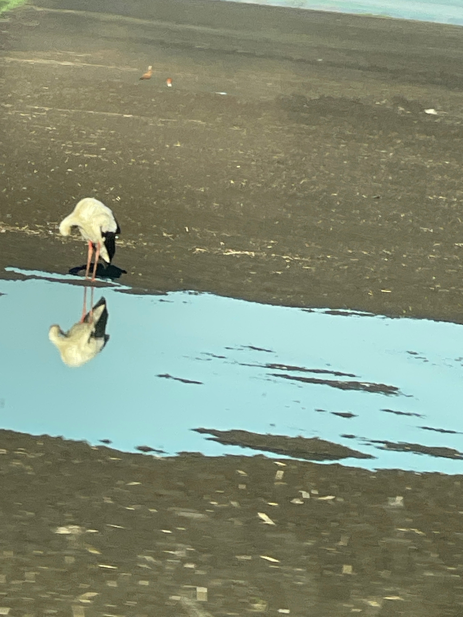 The image shows two birds with black and white plumage and pink legs standing in shallow water. The water is light blue and reflects the sky. The background is a muddy area. The birds appear to be fee…read more