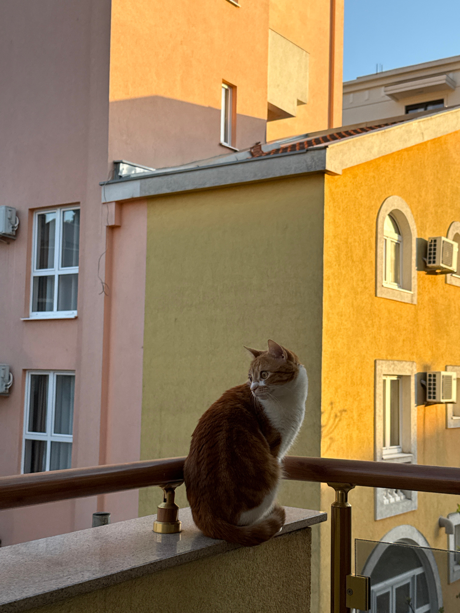 A medium shot, taken from a low angle, depicts an orange and white cat perched on a ledge attached to a building. The cat is looking downwards, with its body curled. The background consists of buildi…read more