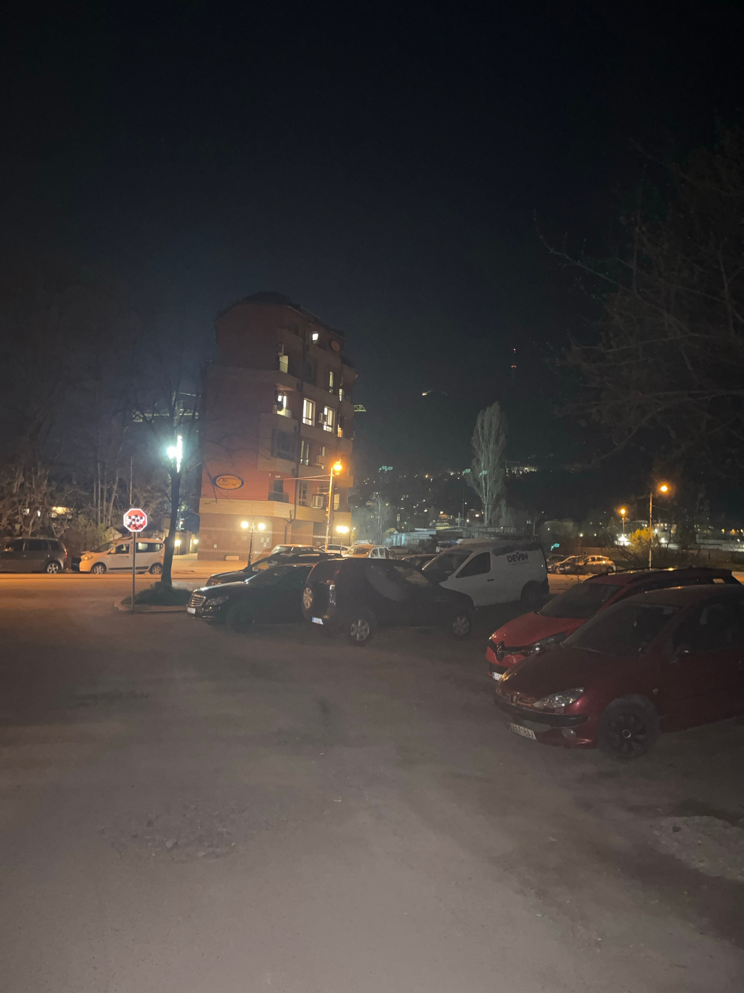 The image shows an urban street scene at night in Sofia, Bulgaria. The perspective is ground-level, with the camera angled upward towards a multi-story building, likely residential. The building appea…read more