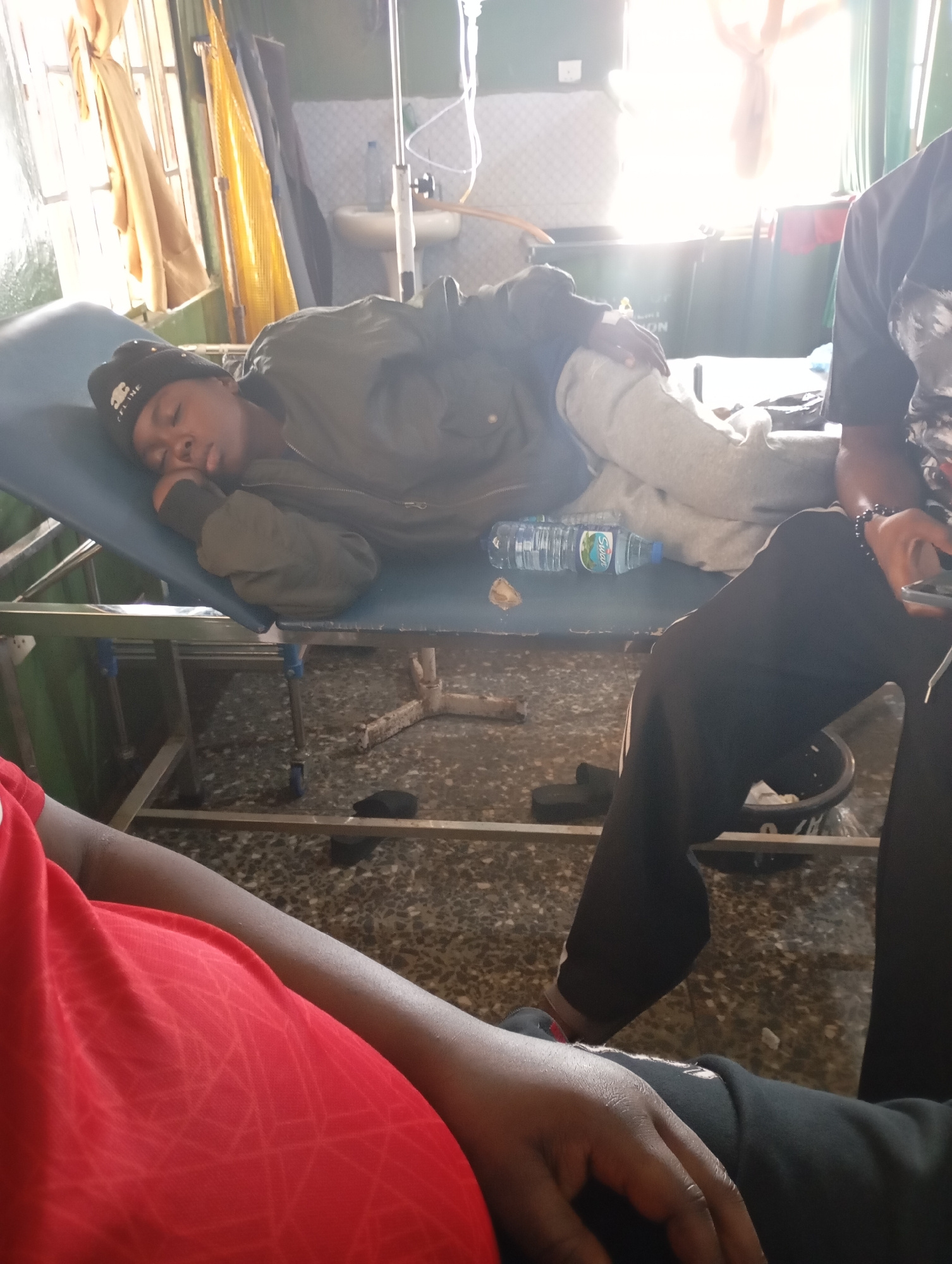 The image captures an indoor scene within what appears to be a medical facility in Jos, Nigeria. In the center, a young individual is lying on a blue medical examination table or stretcher, seemingly…read more