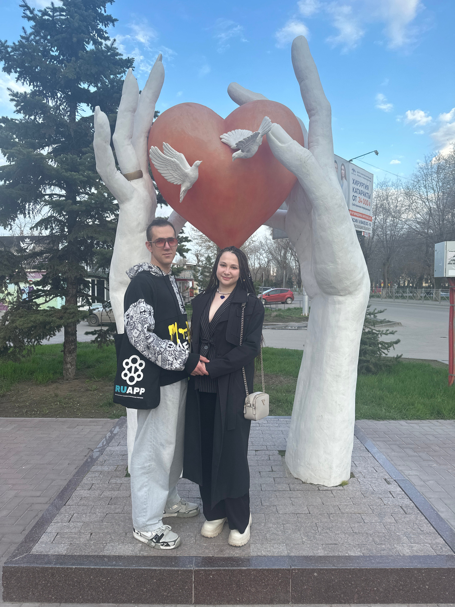 A couple poses for a photo next to a large public art installation. The sculpture features two giant, open, white hands holding a large red heart, with white doves incorporated into the design. The co…read more
