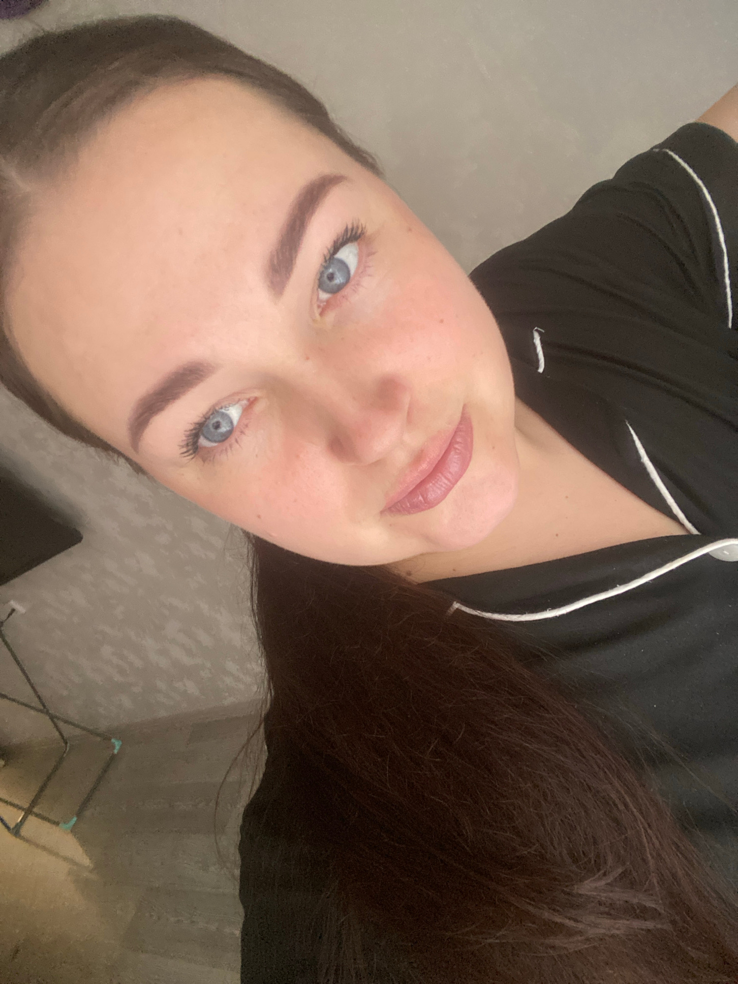 A woman with blue eyes and brown hair is looking up at the camera. She is wearing a black top with white piping. The background is blurry and shows a patterned wall and a clothes drying rack. There is…read more