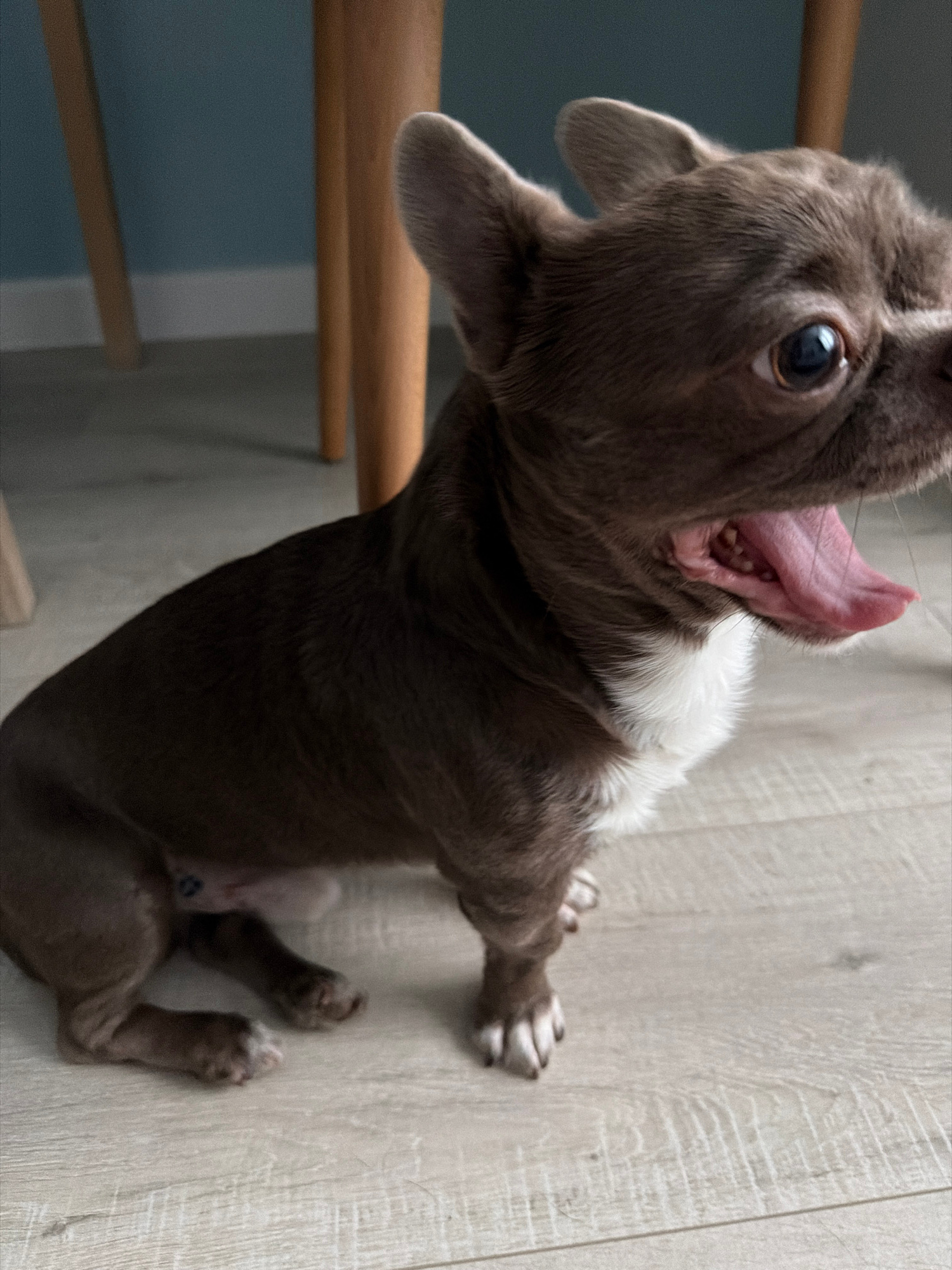 A brown and white French bulldog puppy is lying on its back on a light-colored wooden floor. The puppy's head is tilted back, and its mouth is open, revealing its pink tongue and some teeth. The puppy has white fur around its neck. Part of a wooden structure, possibly stairs or a piece of furniture, is visible on the left side of the image. The wall behind the wooden structure is painted in a light blue or gray color. It is impossible to determine if the location is in Votkinsk, Russia, without additional information. | Open Wire