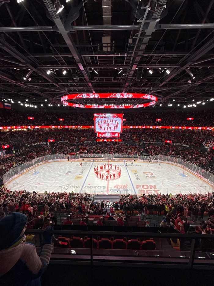 This image captures an overhead view of the Uralets Arena in Yekaterinburg, Russia, during an event. The scene depicts a brightly lit ice hockey rink surrounded by tiered seating packed with thousands…read more