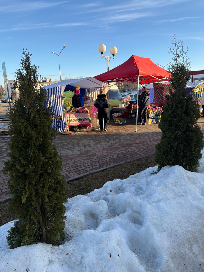 An outdoor market scene is depicted in Valozhyn, Belarus, under a clear blue sky with minimal cloud cover. In the immediate foreground on the right, a large, dirty pile of melting snow is present, wit…read more