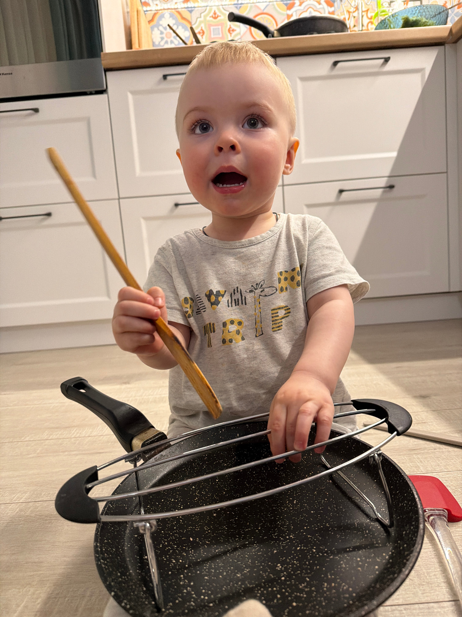 A blonde toddler stands in a kitchen, holding a wooden spoon in one hand and touching a pan rack with the other. The kitchen features white cabinets with black handles, a tiled backsplash, and a stain…read more