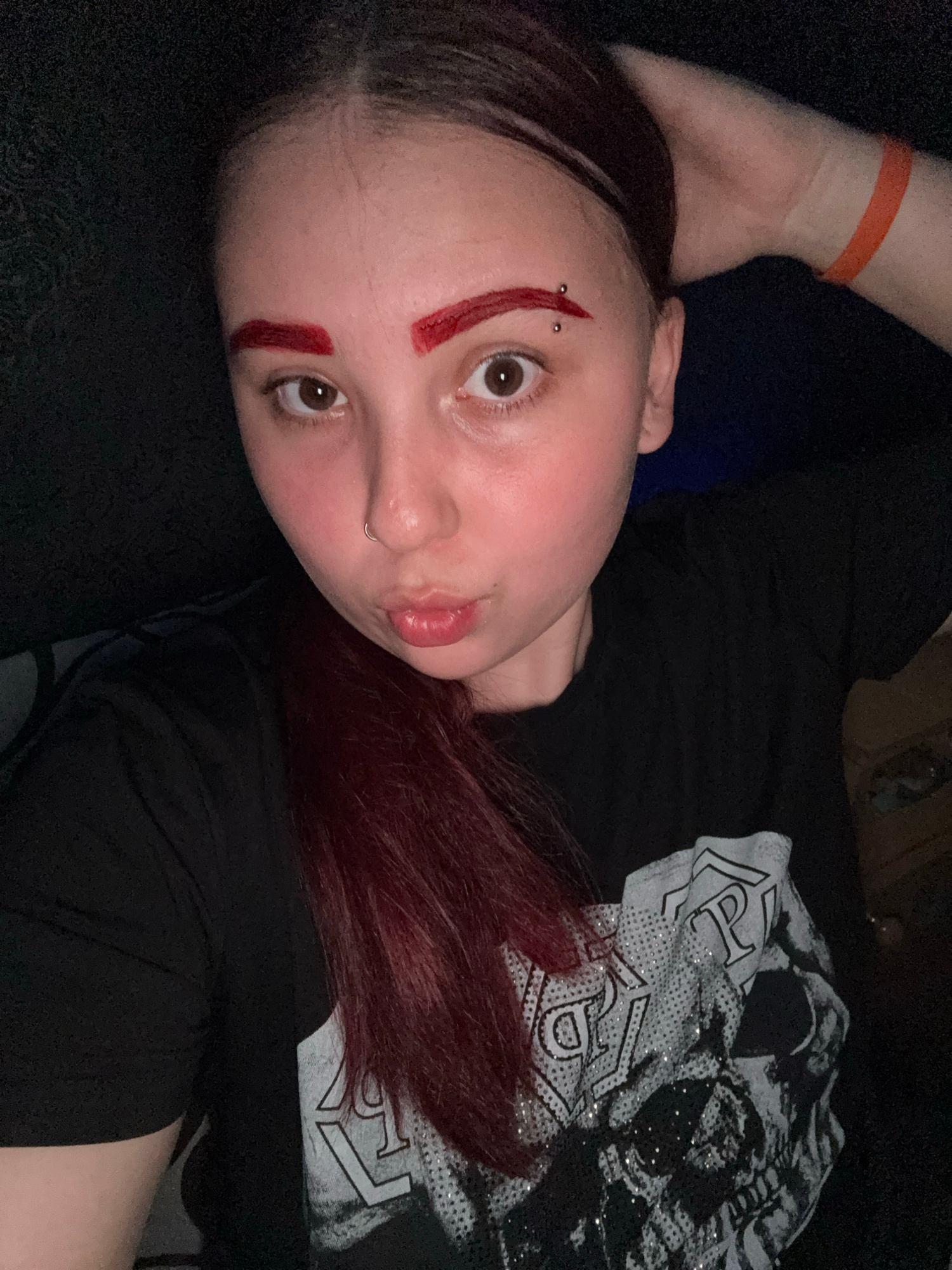 A person is lying down, with their head turned towards the camera. The person has dark hair with red highlights and red markings on their eyebrows. They have a piercing above one eyebrow and a nose ri…read more