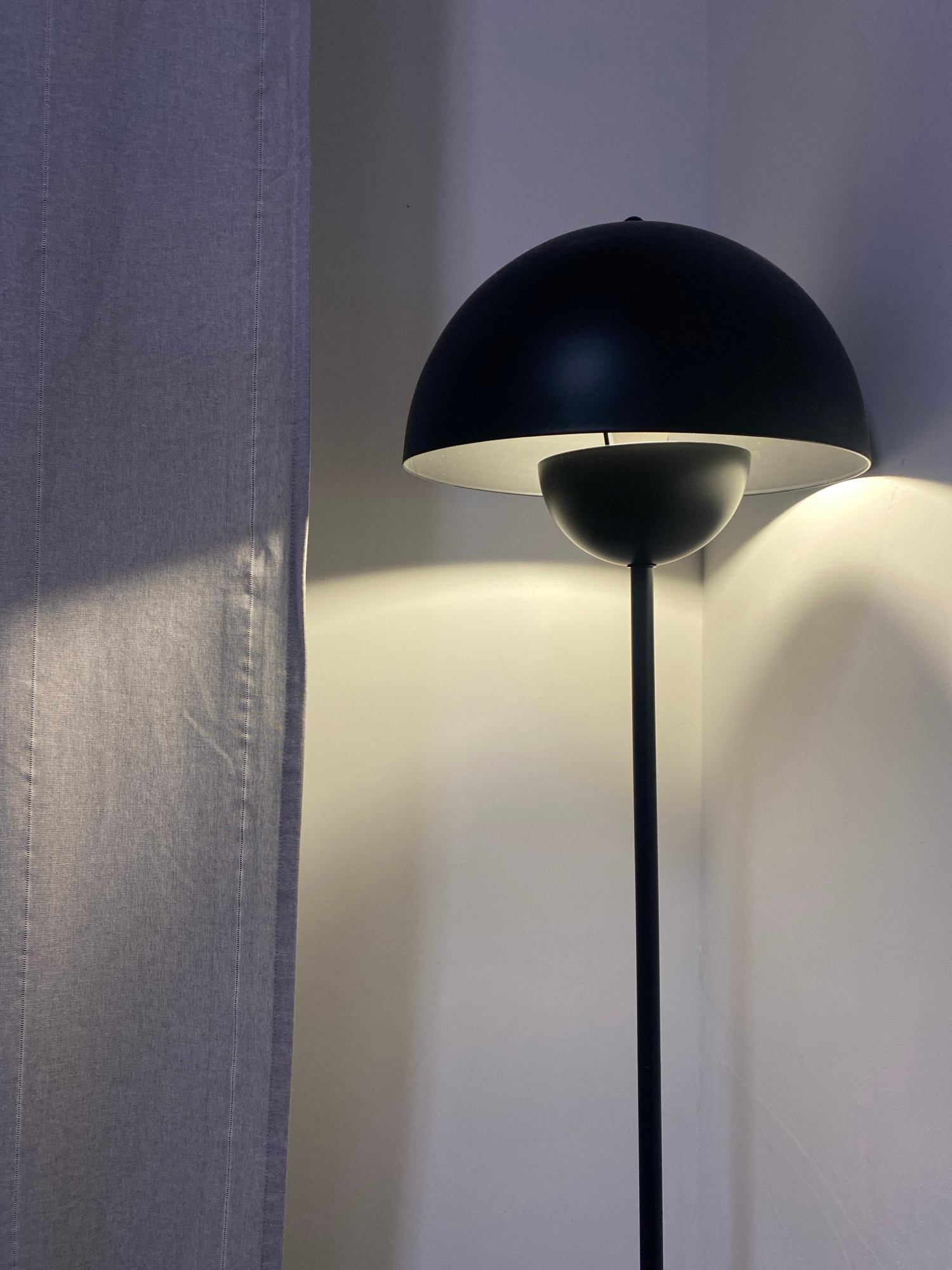 The image shows a black lamp with a spherical shade, attached to a straight pole, standing in front of a textured, grey fabric panel. The lamp is illuminated, casting a bright glow on the wall behind…read more