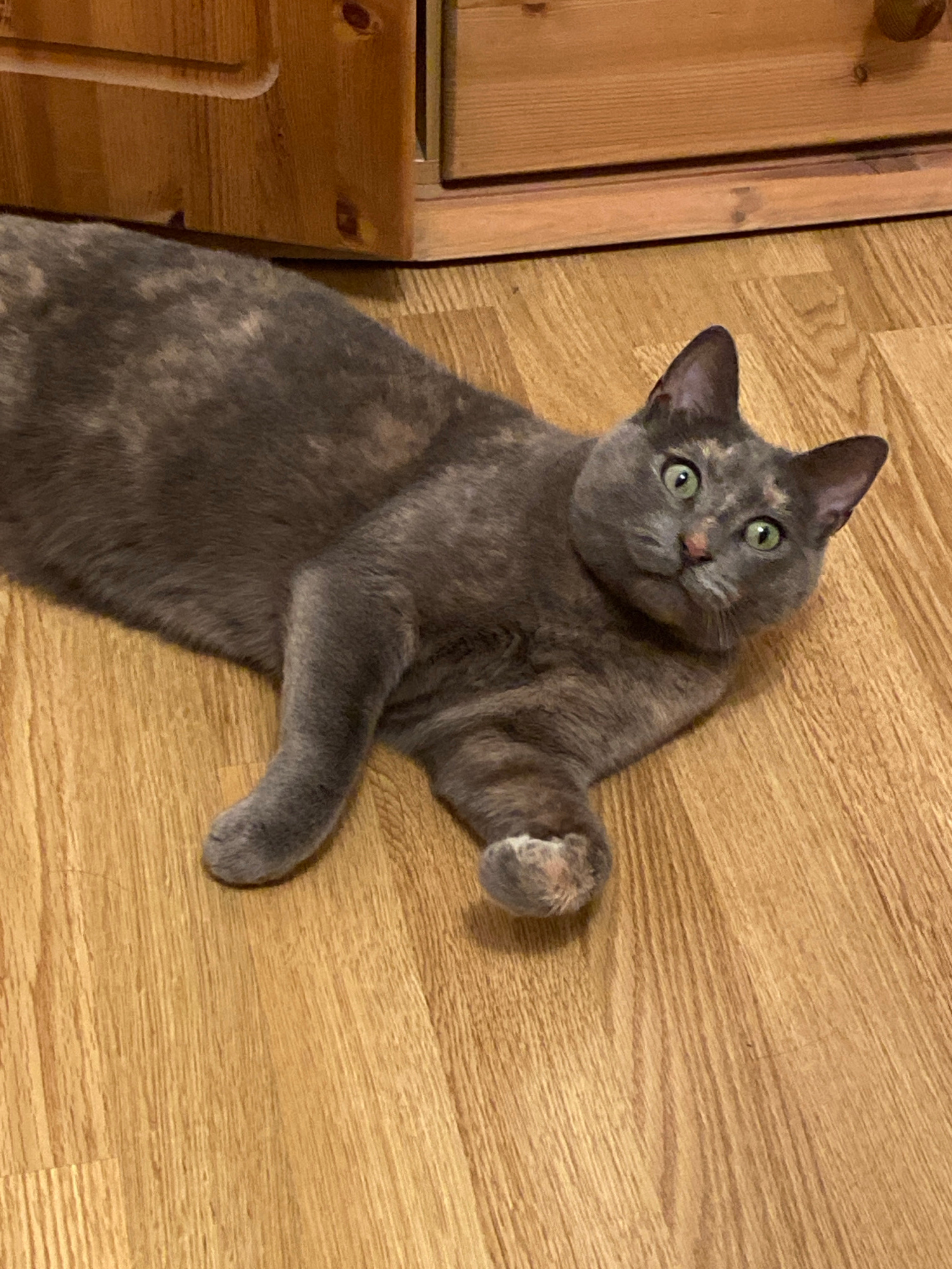 A domestic cat with striking green eyes is the central subject of this indoor photograph, likely taken in Björklinge, Sweden. The cat, exhibiting a dilute tortoiseshell or calico pattern with predomin…read more