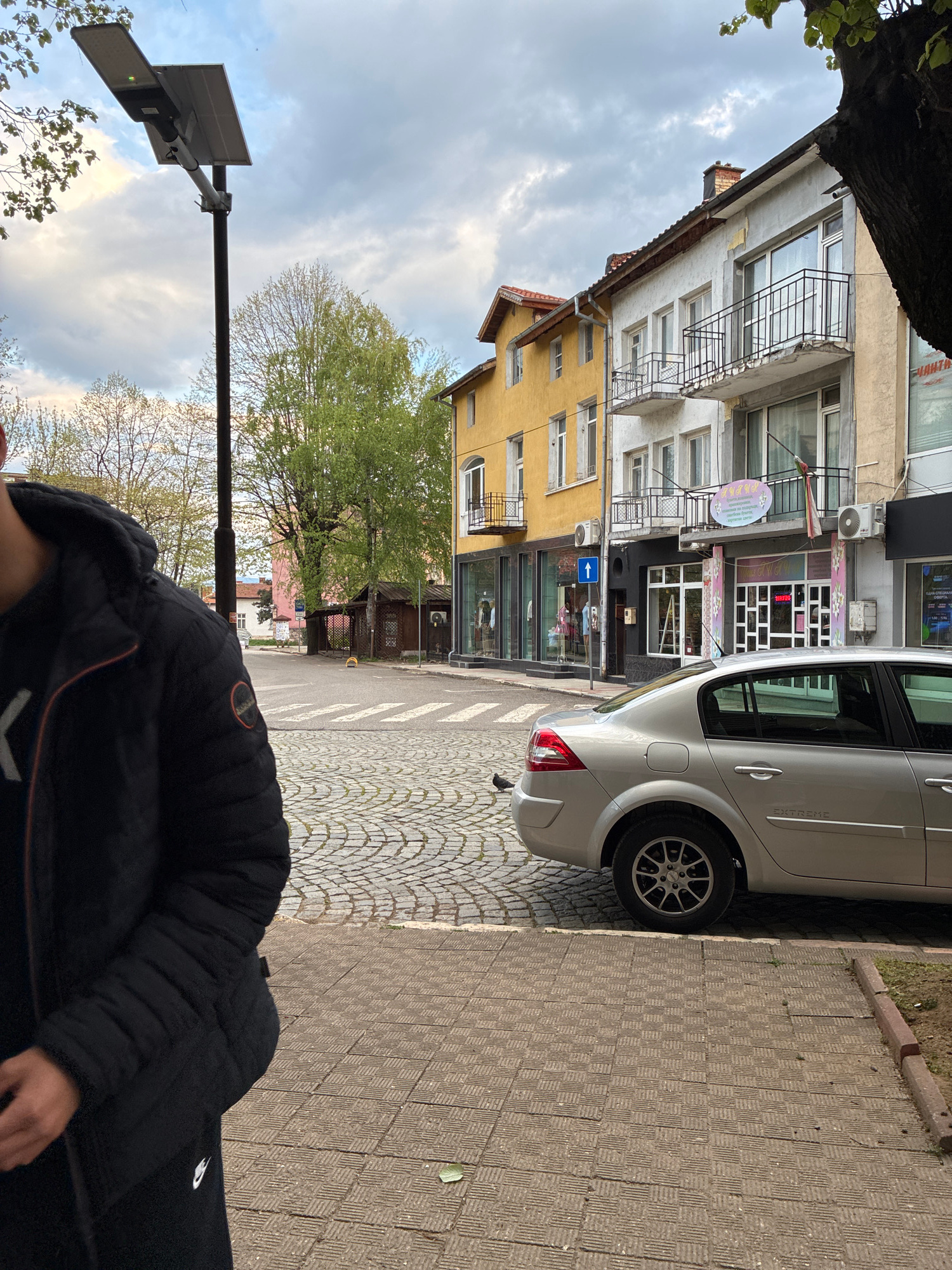 An urban street scene in Berkovitsa, Bulgaria, is captured on a partly cloudy day, likely in the late afternoon or early evening. The image shows a narrow street with buildings lining the left side an…read more