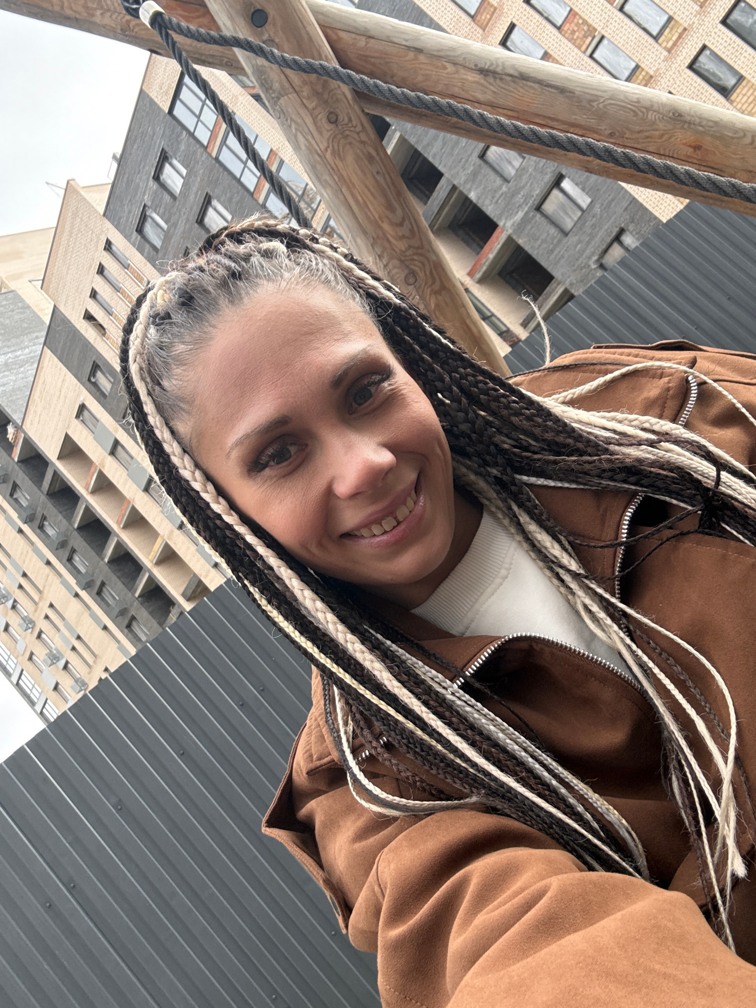 A smiling woman with braided hair is seen from a low-angle perspective against a backdrop of urban architecture. She wears a brown jacket over a white top. Behind her, there are apartment buildings wi…read more