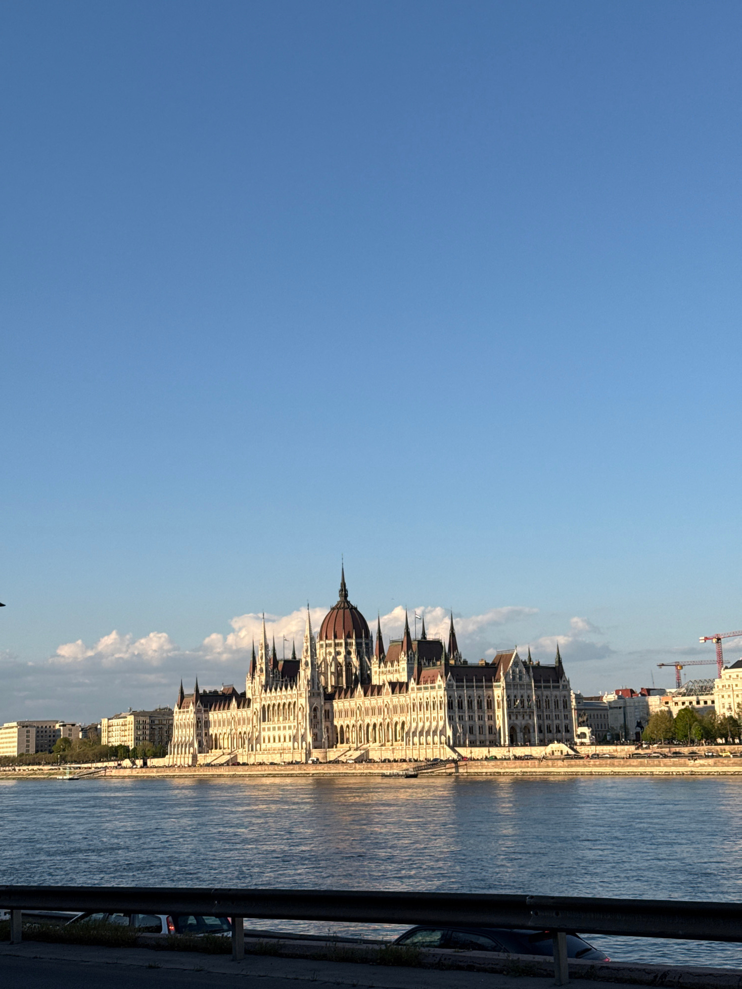 The image shows the Hungarian Parliament Building in Budapest, Hungary, situated along the Danube River. The building, a large neo-Gothic structure, is visible in its entirety, with its central dome a…read more