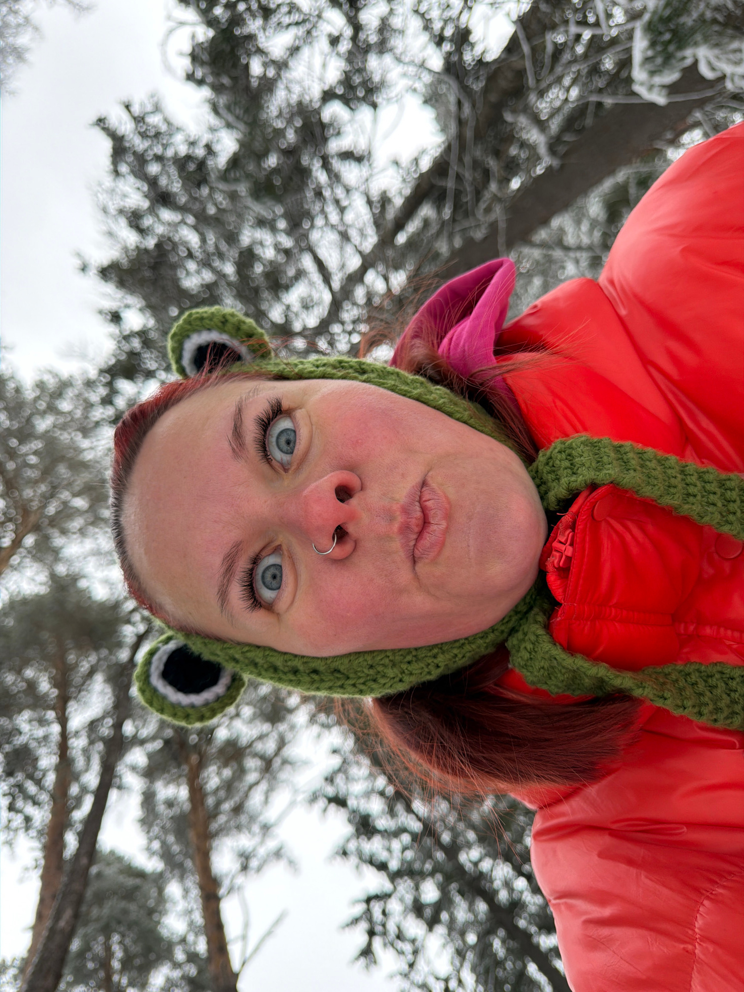 The image is an upside-down portrait of a person with red hair, wearing a green crocheted frog-shaped hat with a pink balaclava underneath, and a red puffer jacket. The person has blue eyes and a nose…read more
