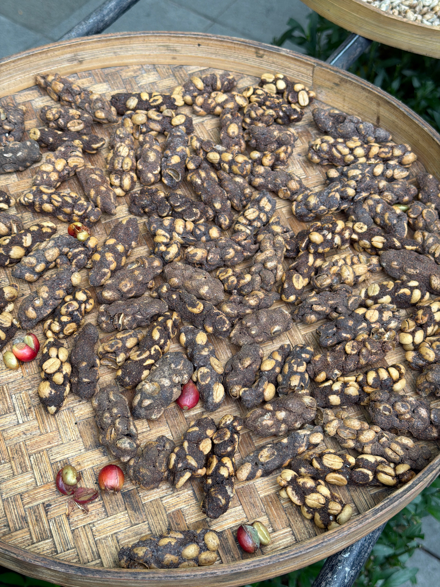 On a woven bamboo tray are numerous oval-shaped clumps covered in dark brown material, each exposing tan-colored bean-like forms. Interspersed among these clumps are a few red coffee cherries, some wi…read more