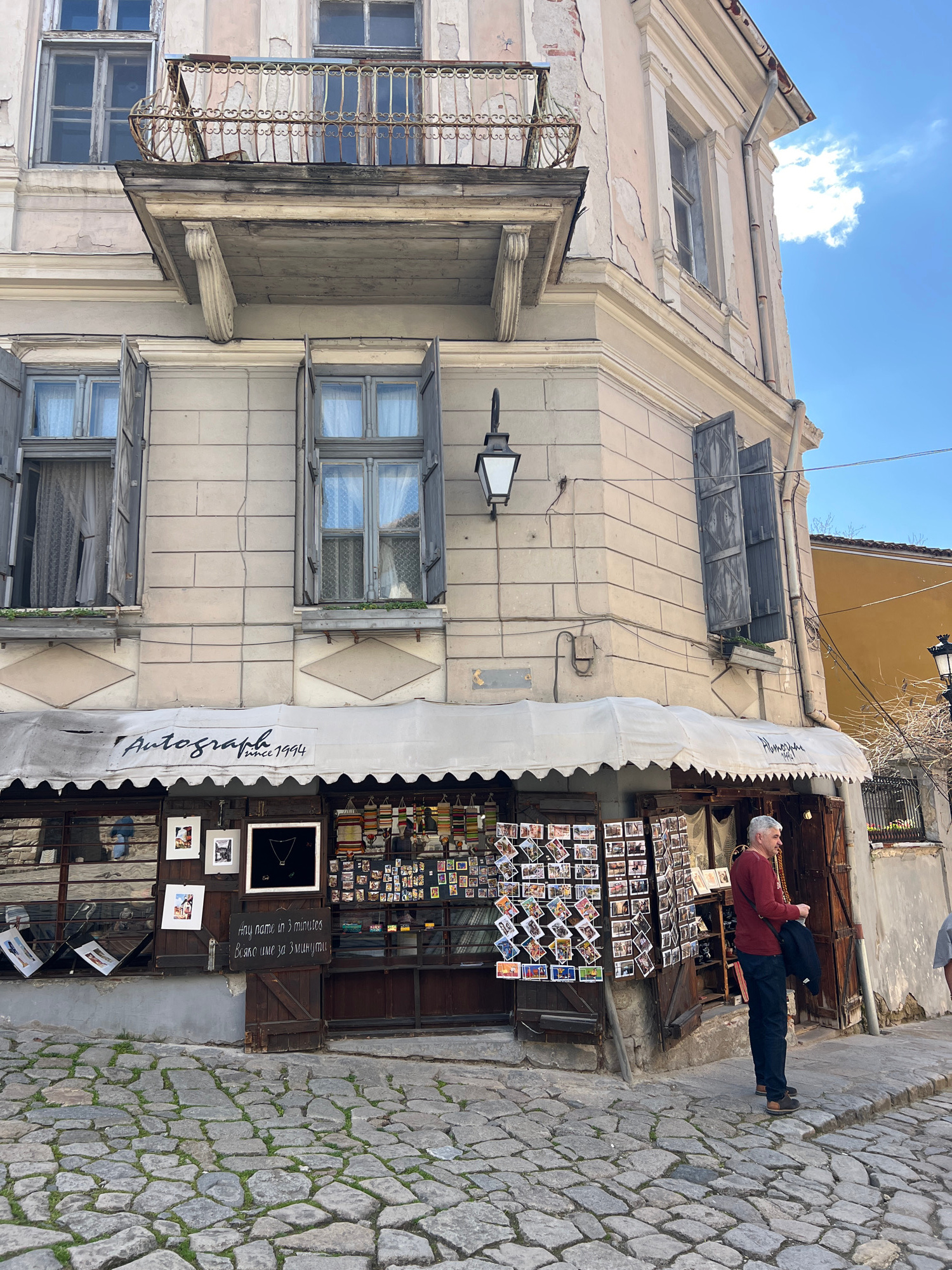 The image captures a street scene in Plovdiv, Bulgaria, featuring a building with aging architecture and a photography shop. The building's façade shows signs of wear, with peeling paint, aged windows…read more