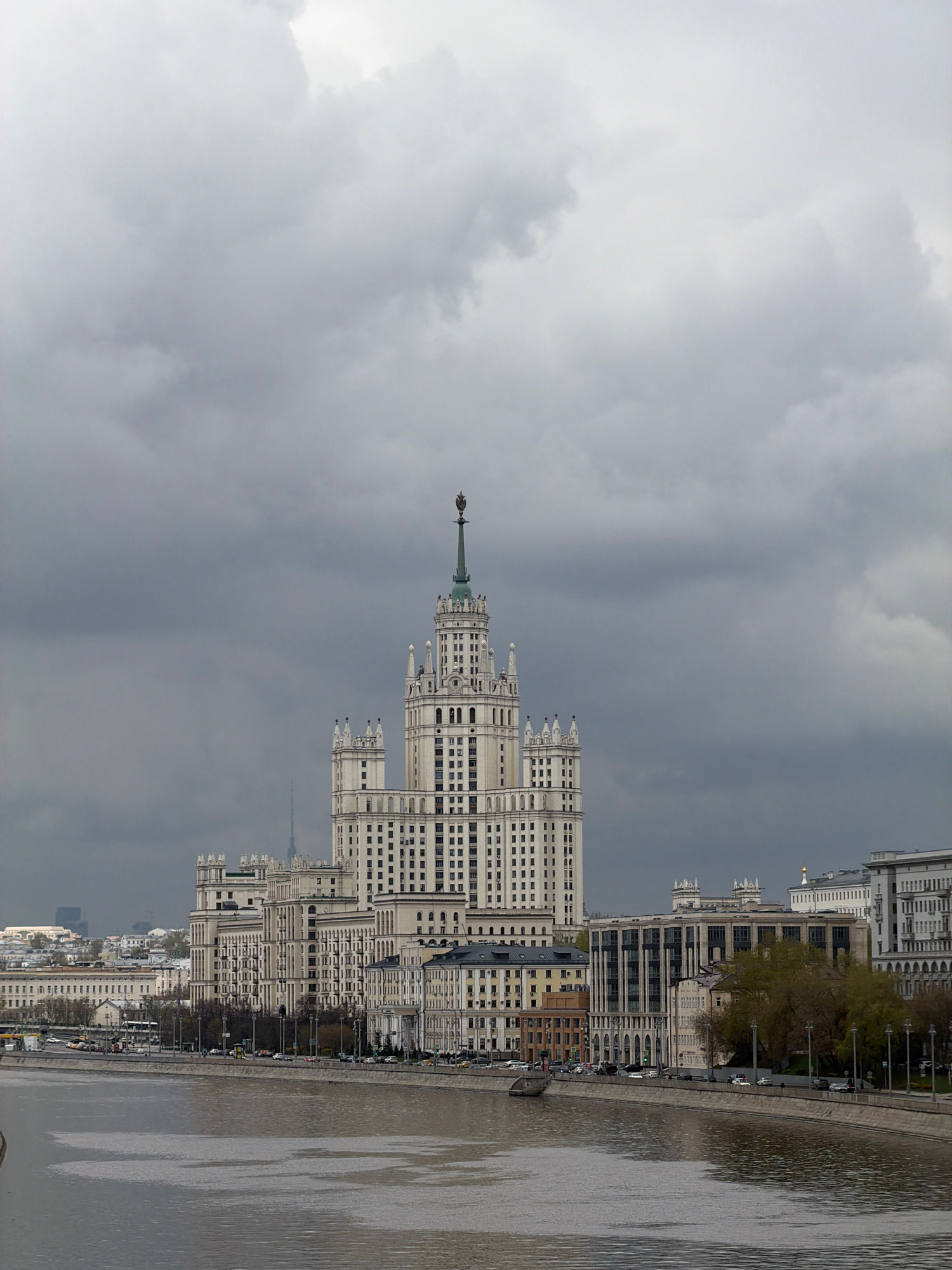 This media file captures a wide view of the Moskva River embankment in Moscow, Russia, under an overcast sky. The image is oriented vertically, showing the river on the right and city buildings on the…read more