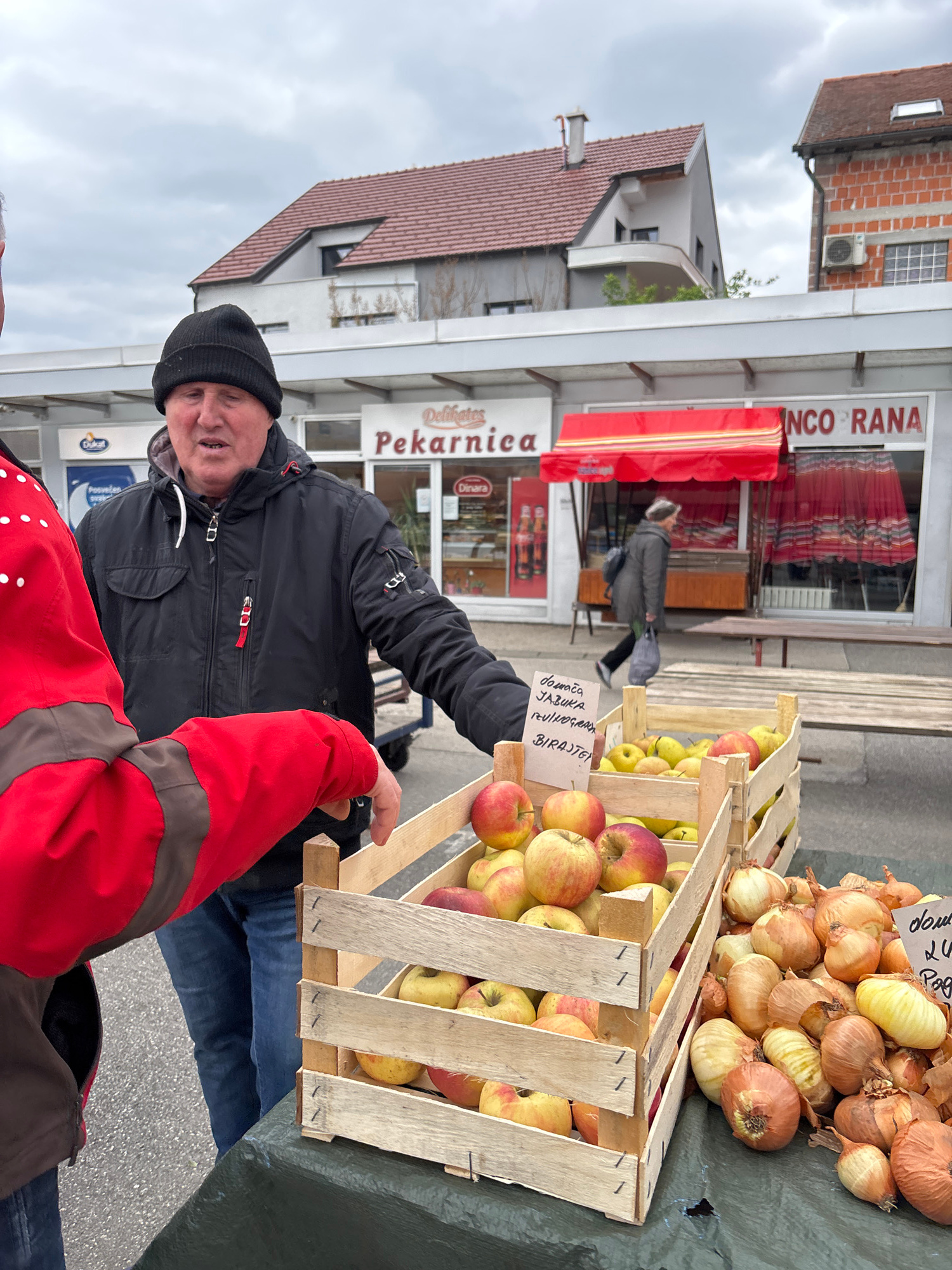 The image captures a street scene in the City of Zagreb, Croatia, showcasing a fruit and vegetable vendor engaged with a customer. The vendor, wearing a black beanie and jacket, stands beside wooden cā¦read more