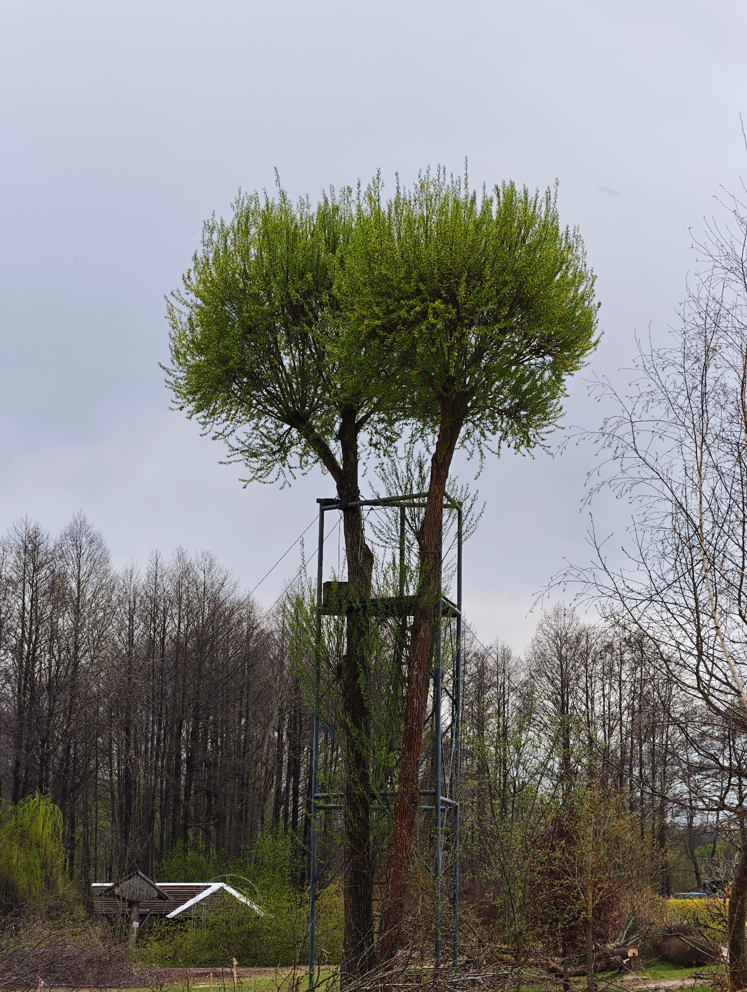 The image depicts a tree in Капцёўскі сельскі Савет, Belarus. The tree's trunk splits into two, and a metal structure surrounds the base and lower branches. The tree's foliage is dense and green. In t…read more