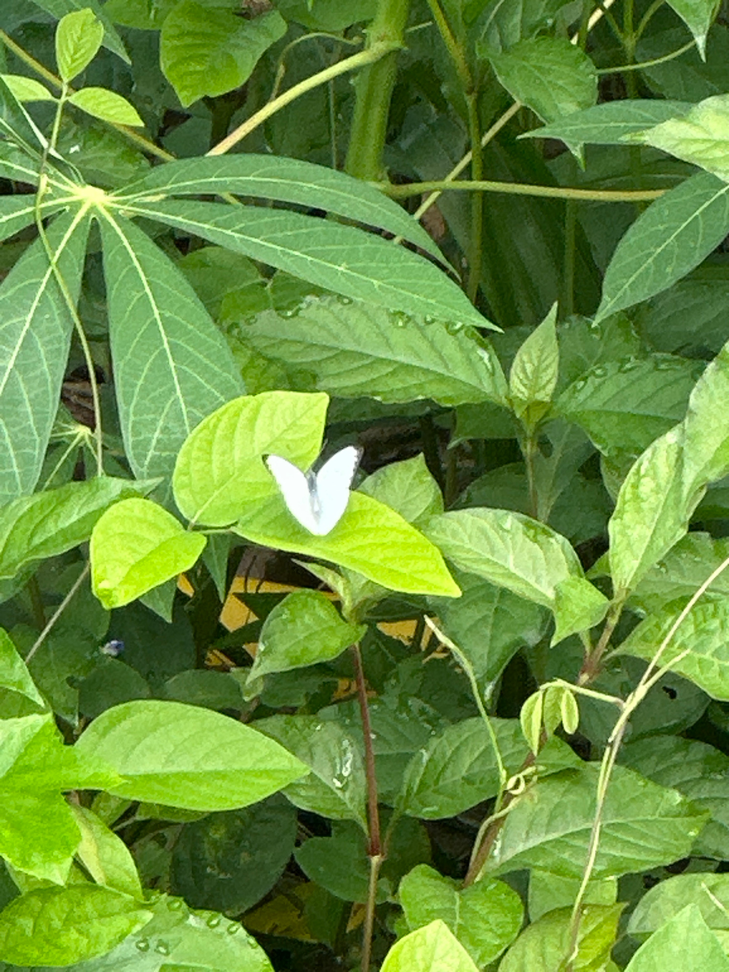 This close-up image captures a small white butterfly resting on a bright green leaf amidst dense foliage, likely in a natural environment in Ikot Ekpene, Nigeria. The butterfly, with its wings folded…read more