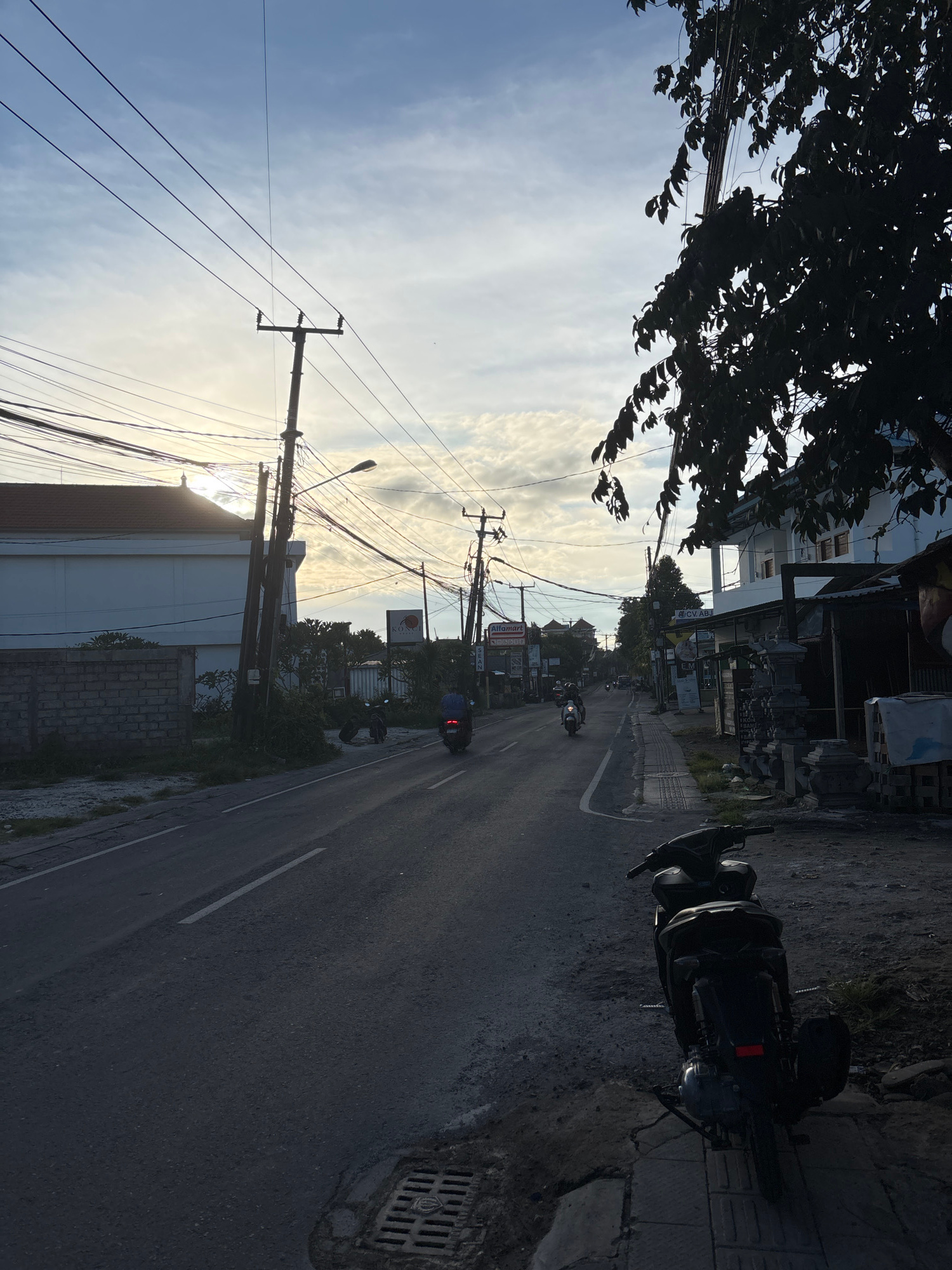 A street scene in Ungasan, Indonesia, shows a paved road stretching into the distance with motorcycles traversing it. Buildings line the sides of the road, with trees partially obscuring the view andβ¦read more