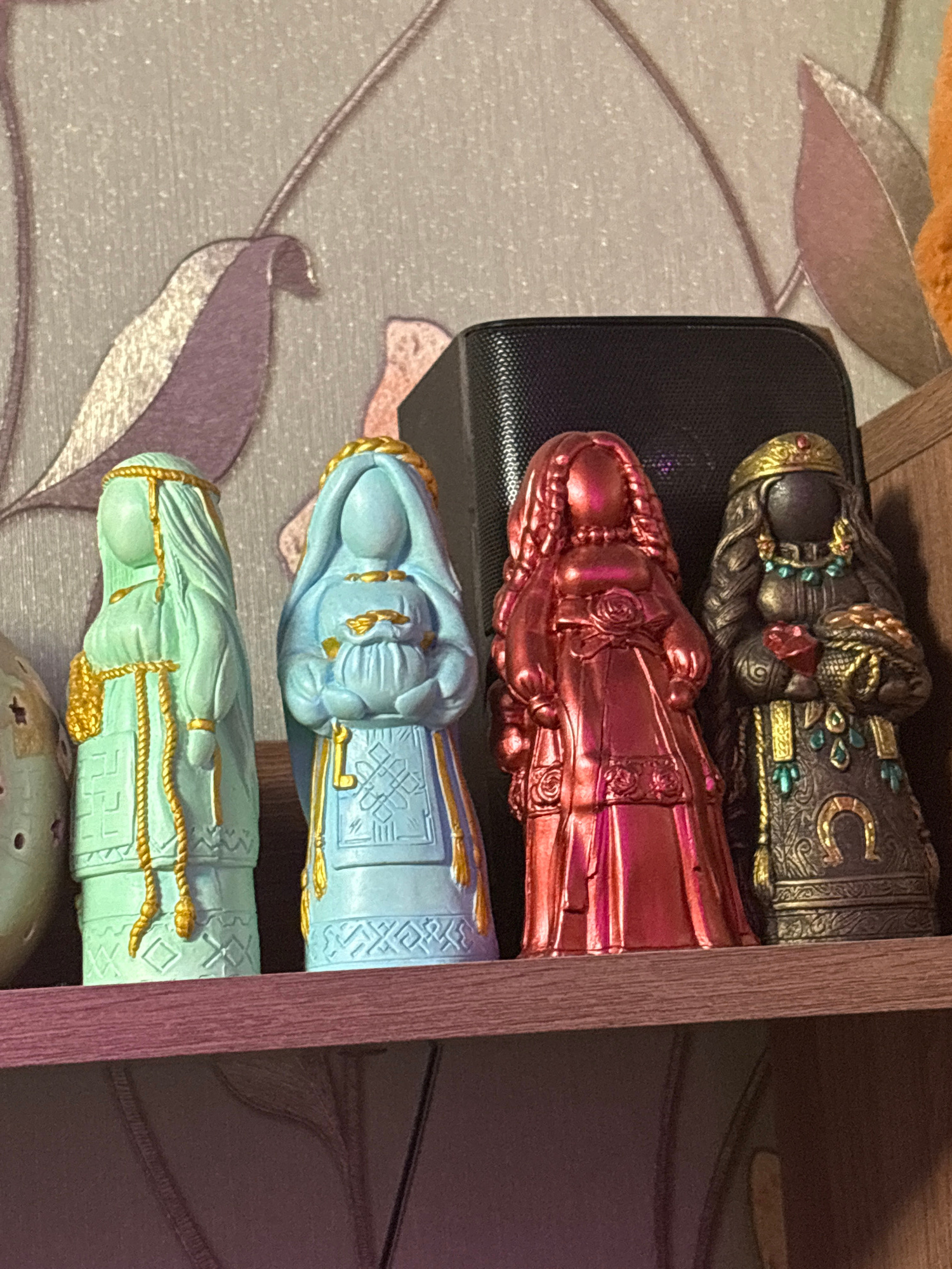 The image shows four painted figurines arranged on a shelf. The top figurine is dark, with gold and turquoise accents, and features a horseshoe design. Below it is a pink figurine, followed by a light…read more