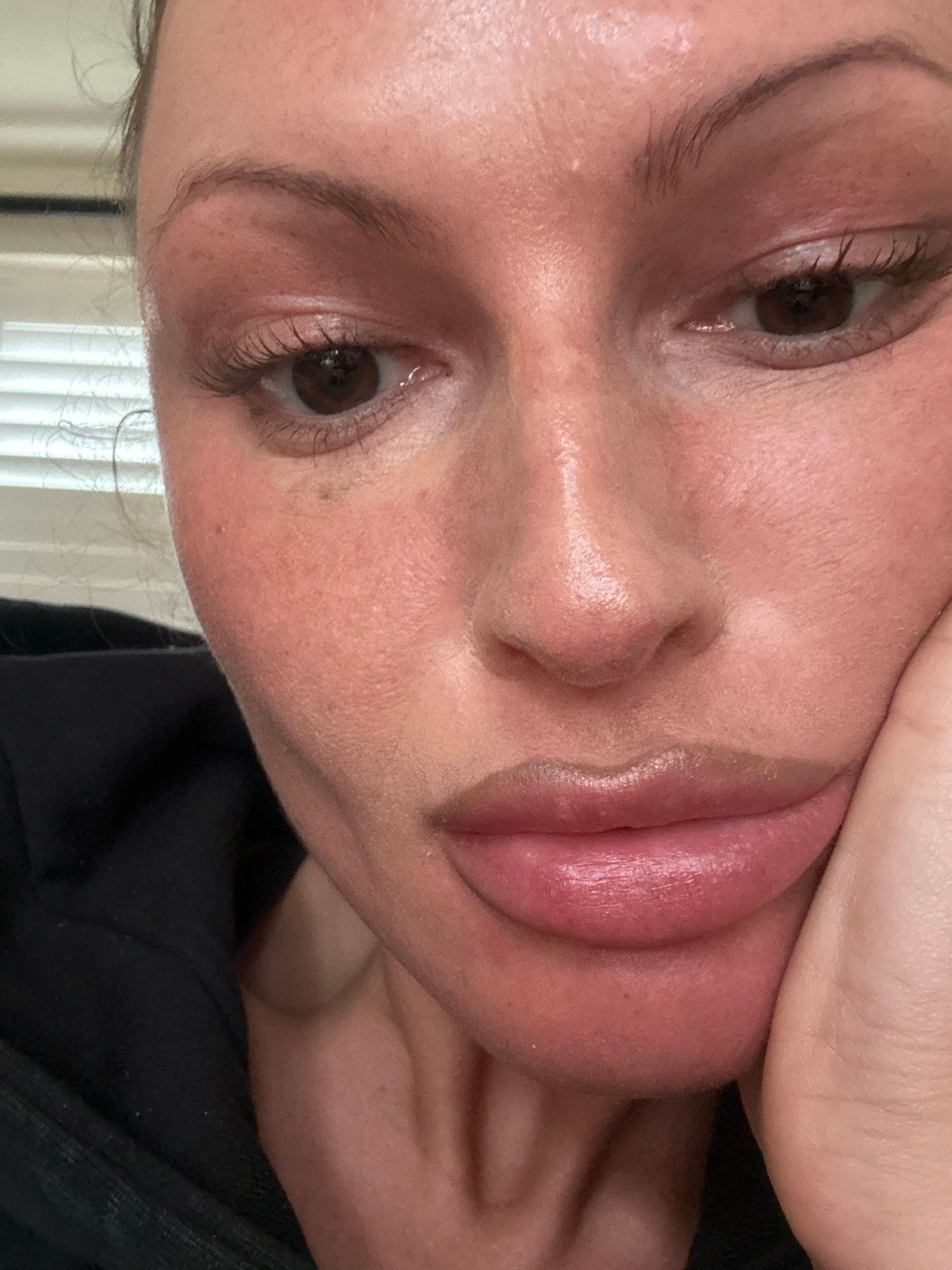 A close-up, vertical portrait shows an adult female individual's face from the forehead to the lower chin. The skin exhibits generalized erythema (redness) across the cheeks, nose, and periorbital are…read more