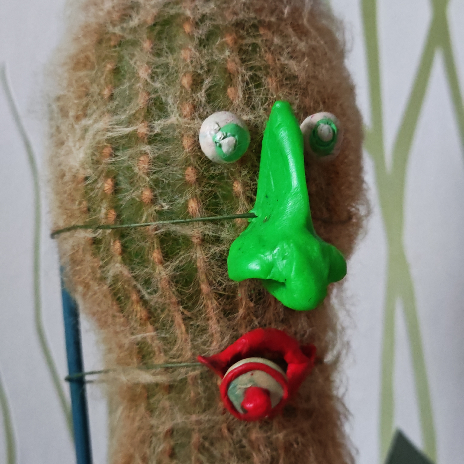 A cactus with a face made of clay is the central subject of the image. The face includes clay eyes, a large green nose, and red lips. Thin green wire is used to attach the clay features to the cactus.…read more