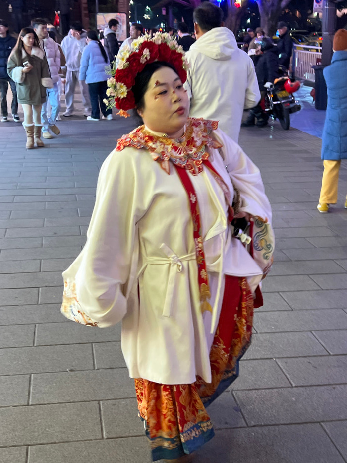 An adult individual, appearing female, is centrally positioned on a paved pedestrian walkway, facing slightly right, in what appears to be a nighttime urban setting within Yuzhong District, China. The…read more