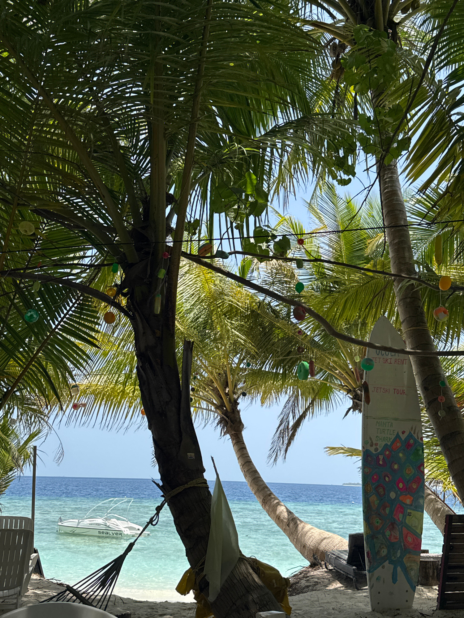 The image captures a scene in Ukulhas, Maldives, framed by palm trees adorned with colorful, spherical decorations. A surfboard with drawings and the words "Manta Turtle Shark Jet Ski Tour" is affixed…read more