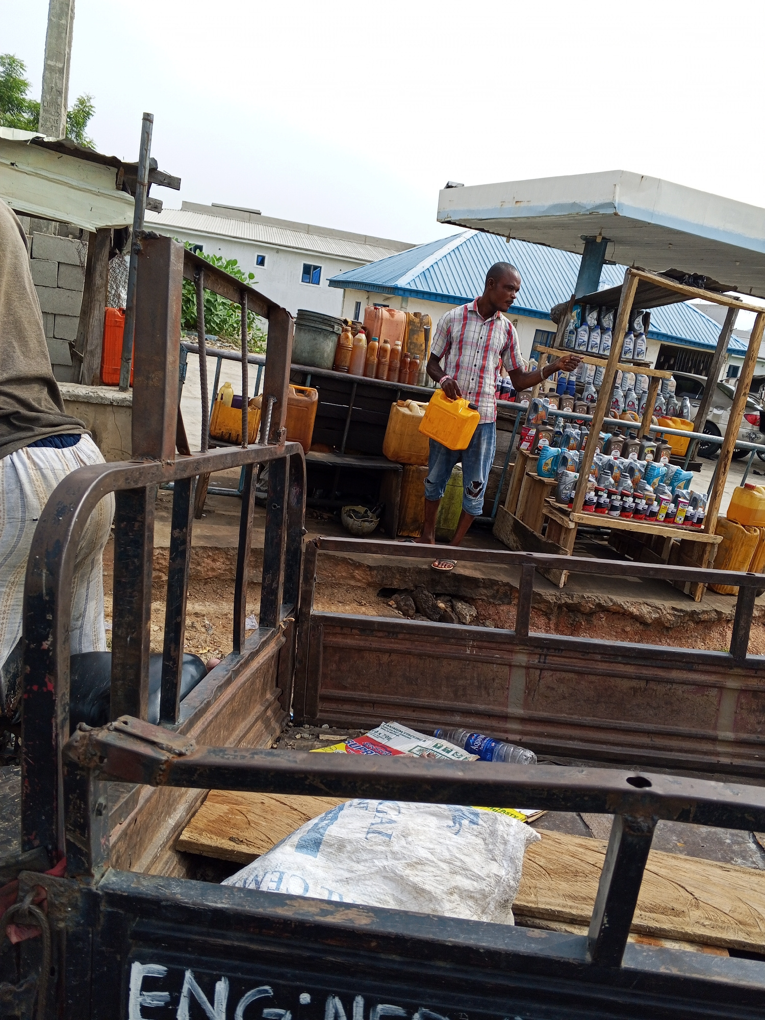 The scene is located in Zango-ndaji, Nigeria. A man stands in front of a makeshift wooden stand displaying rows of bottled liquids, likely motor oil, in a roadside market or informal retail setting. H…read more