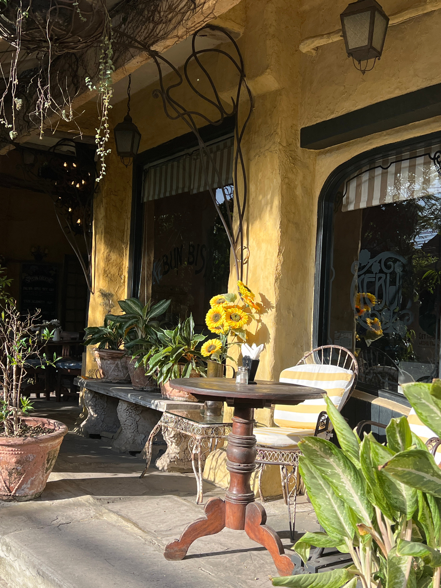 The image shows an outdoor seating area in what appears to be a commercial district. The setting is the Ubud District in Indonesia. Visible architectural elements include a textured, yellow-painted fa…read more