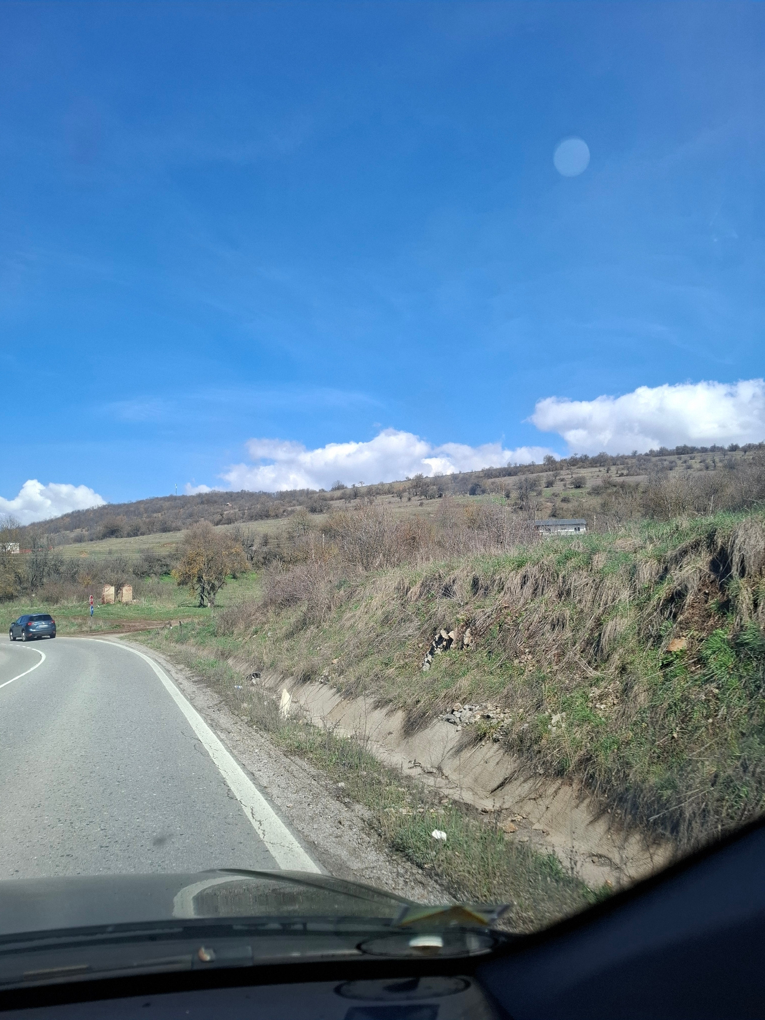 The image shows a view from inside a vehicle on a road in Iskrets, Bulgaria. The road curves to the right, marked by a white line on the shoulder. A dark-colored car is visible on the road ahead. The…read more