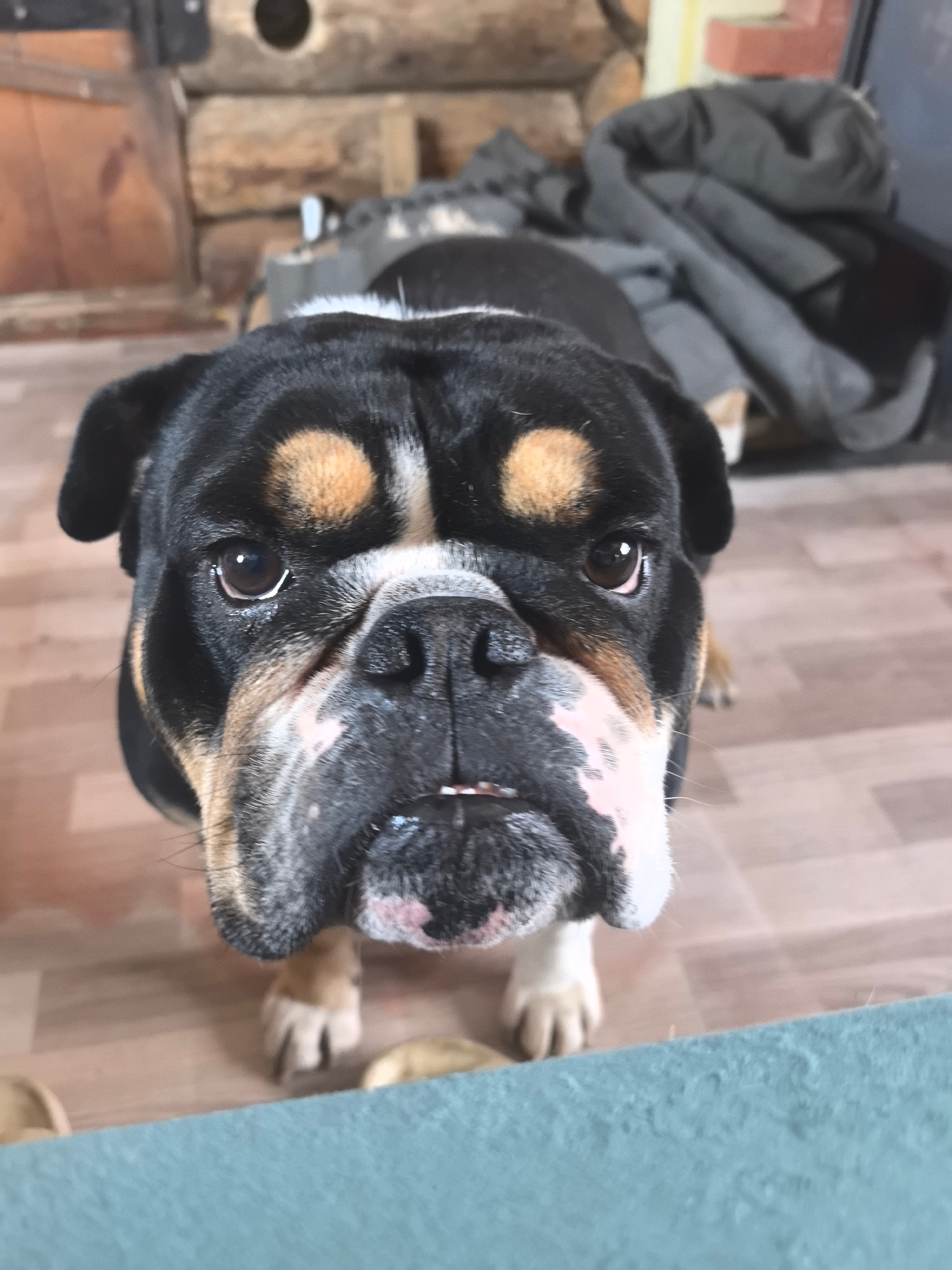 The scene depicts an indoor setting. A brindle, black, and tan bulldog, primarily dark in coloration with distinctive tan patches above its eyes and on its cheeks, and a white muzzle, is positioned in…read more