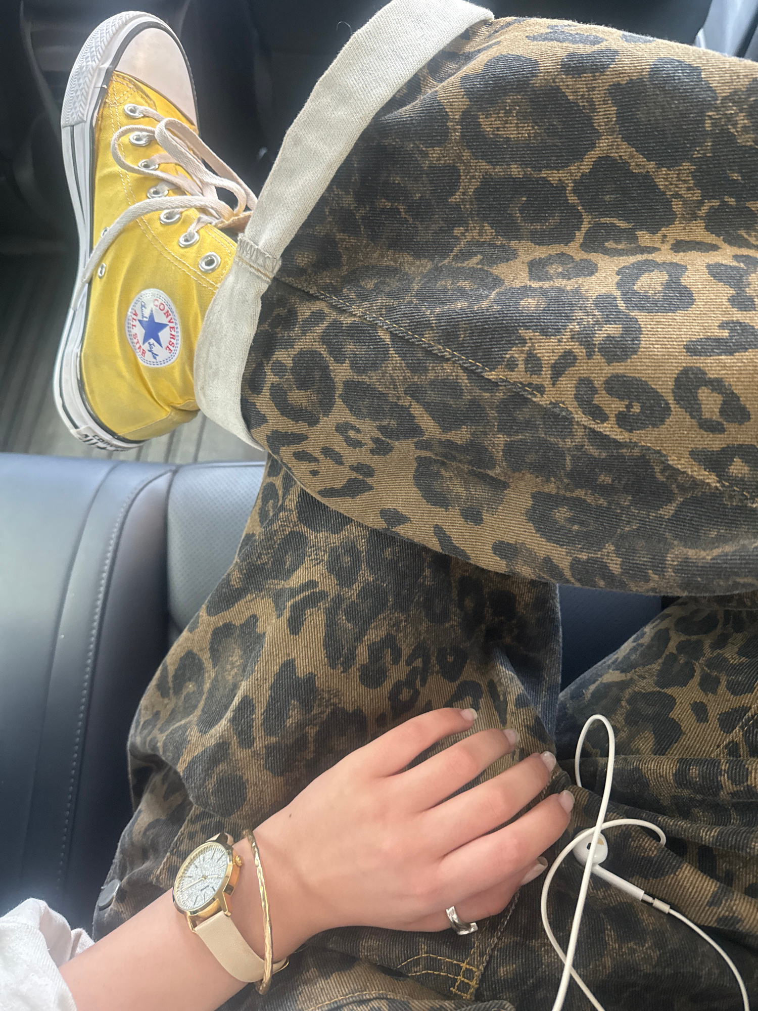 A close-up shot presents a person seated, likely in a vehicle, wearing leopard-print denim pants and yellow Converse sneakers. The left pant leg is rolled up, revealing the denim's inner lining. White…read more