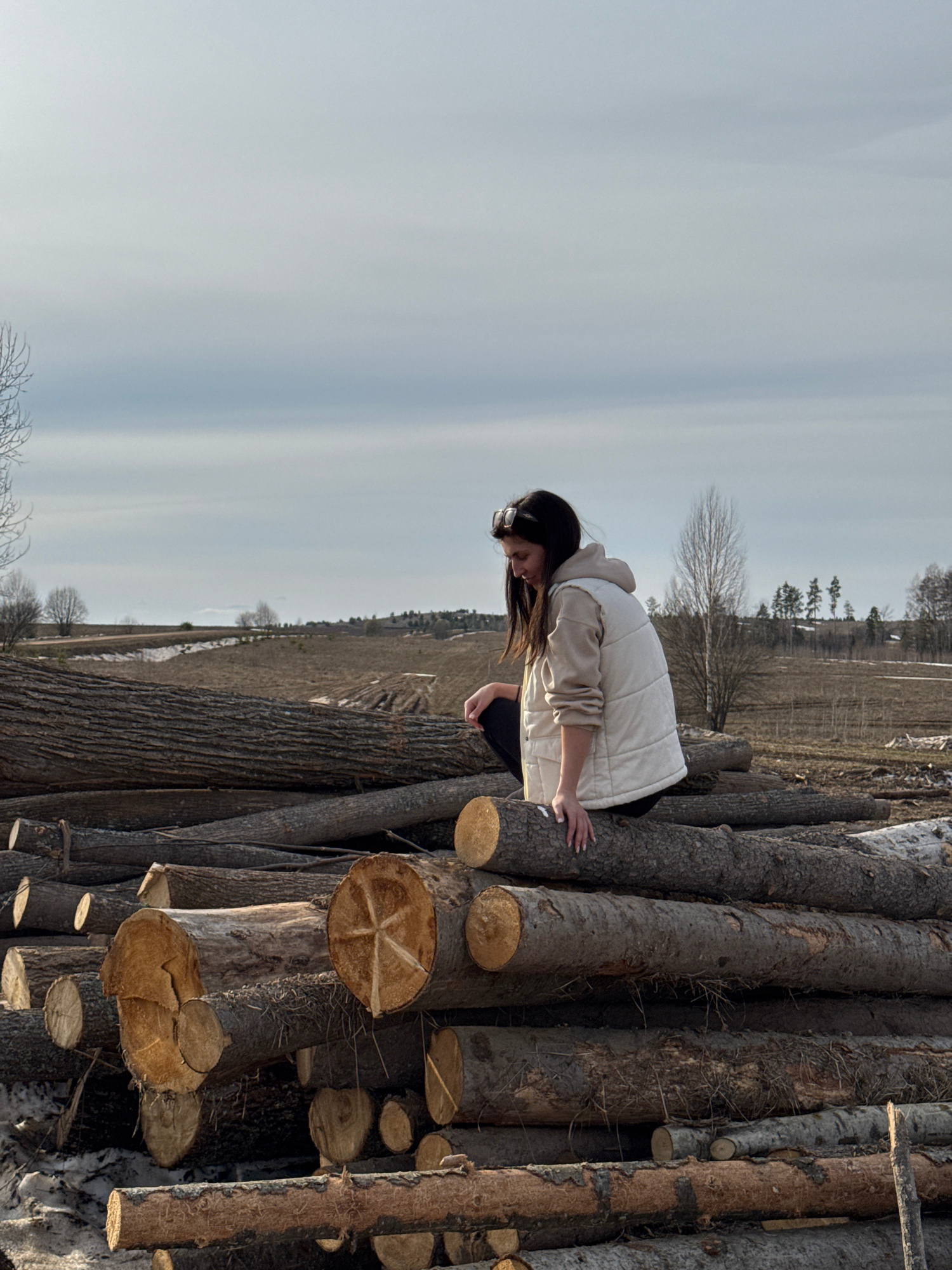 The image shows a stack of logs in an open field, likely a logging site or storage area. A woman is positioned on top of the logs. She has dark hair and is wearing sunglasses, a light-colored hooded jā¦read more