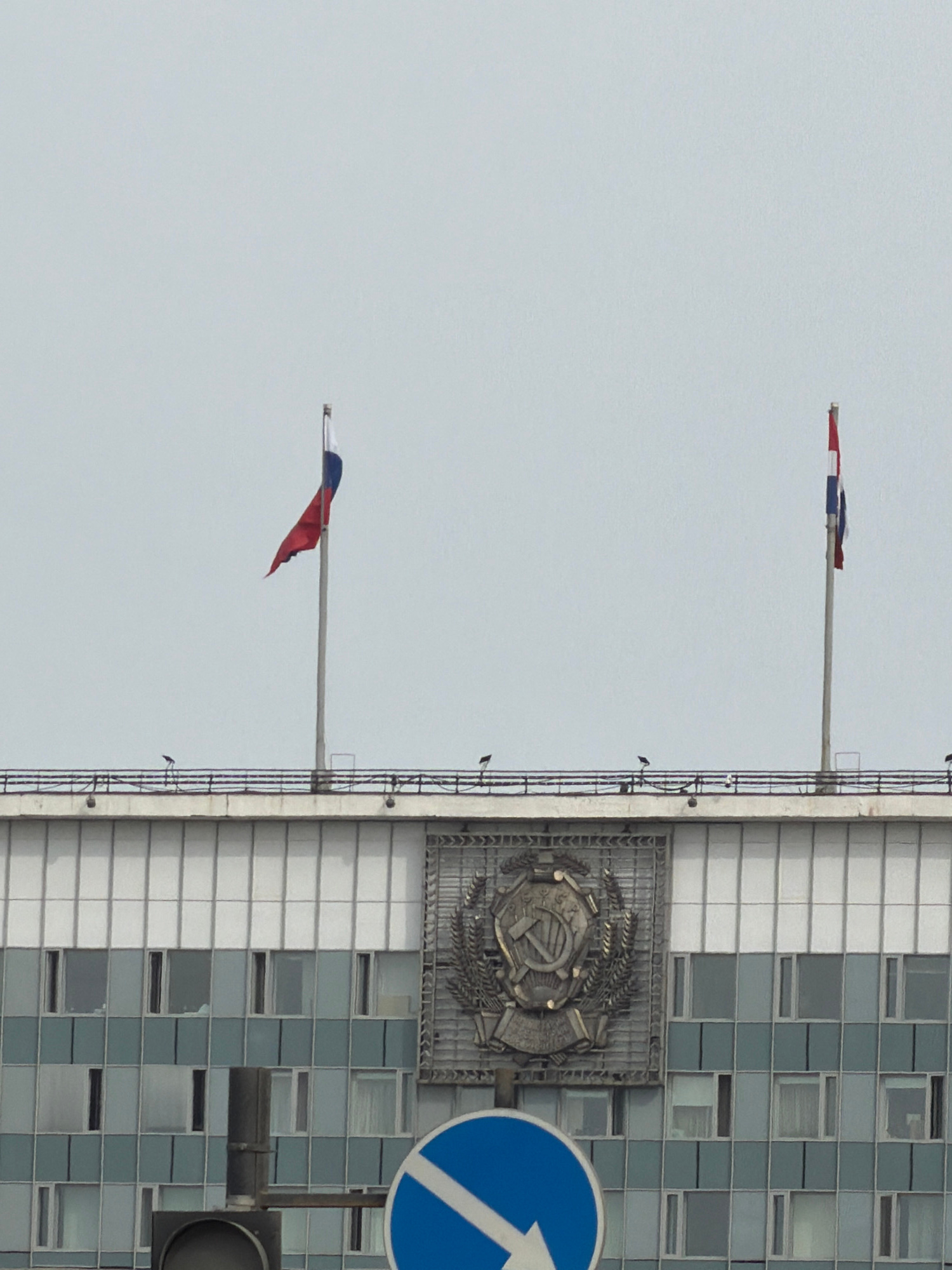 The image shows a section of the administrative building on Karl Marx Street 70A in Perm, Russia, viewed from below and at an angle. The building's facade is composed of numerous rectangular windows a…read more