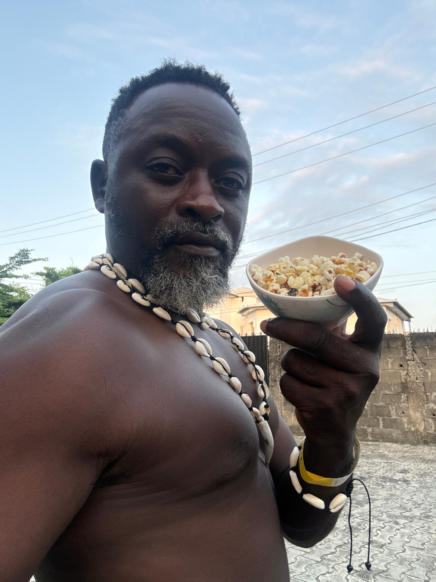 A middle-aged, dark-skinned man with a graying beard and mustache is holding a small bowl of popcorn in his right hand. He is wearing a necklace made of cowrie shells and a bracelet of shells and a ye…read more