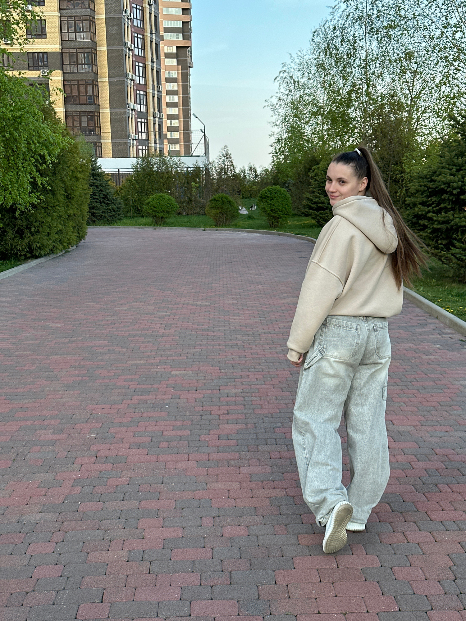 A young woman stands on a brick pathway in Rostov-on-Don, Russia. She wears a beige hoodie and light gray jeans, with matching beige sneakers. Her long brown hair is pulled back into a ponytail. The p…read more