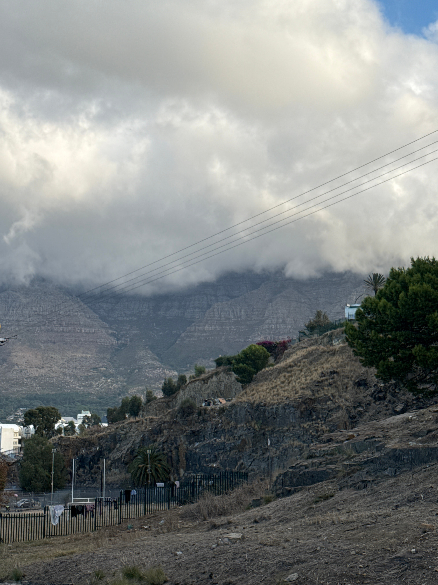 The image captures a view of Table Mountain in Cape Town, South Africa. The mountain is partially obscured by clouds, with power lines visible in the foreground. The right side of the image features a…read more