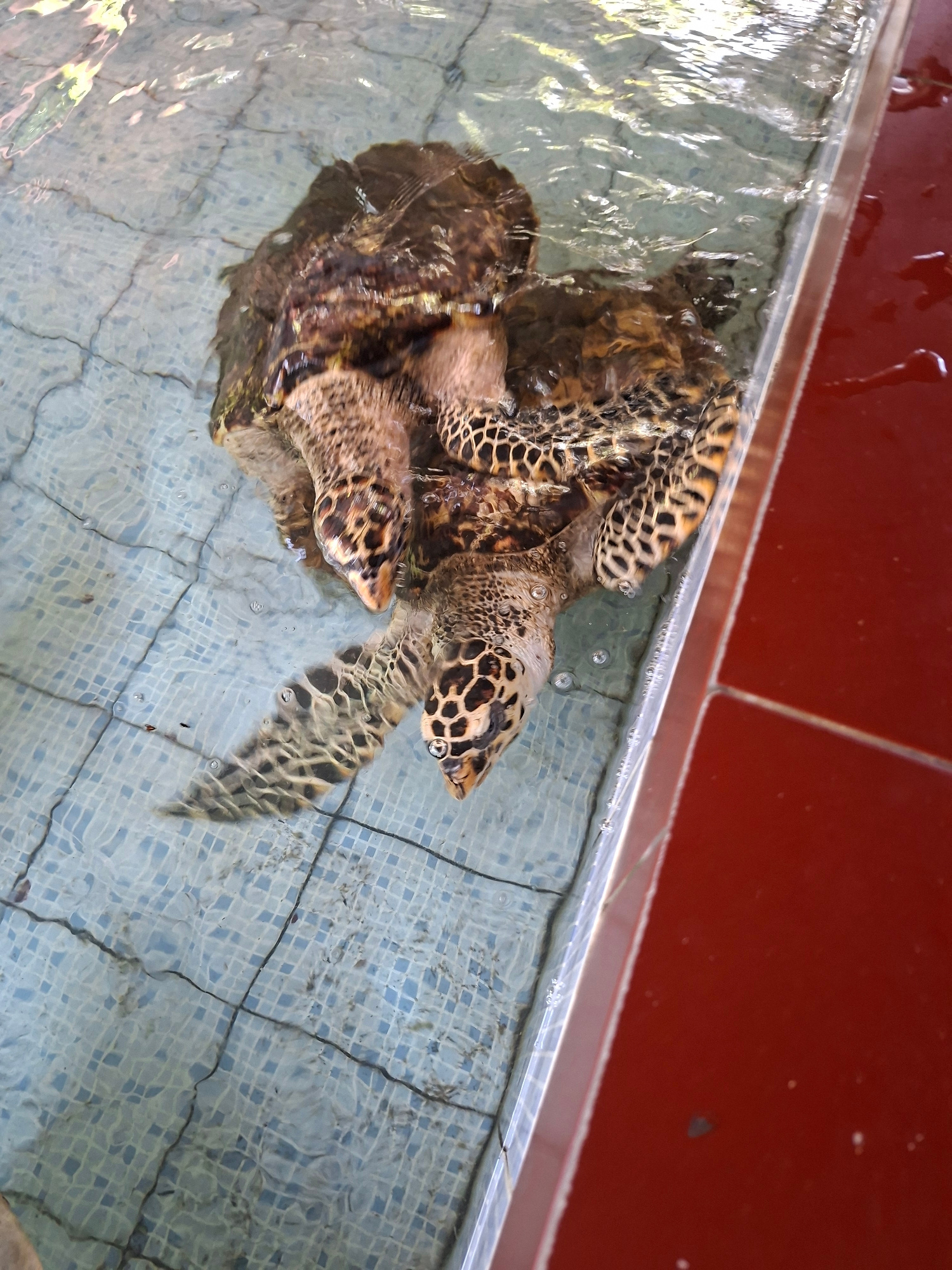 A spotted turtle swims in a shallow, tiled, possibly artificial pool in Denpasar, Indonesia. The pool's water is clear and rippled. The pool's edge is lined with red tiles. The turtle's shell is a dar…read more