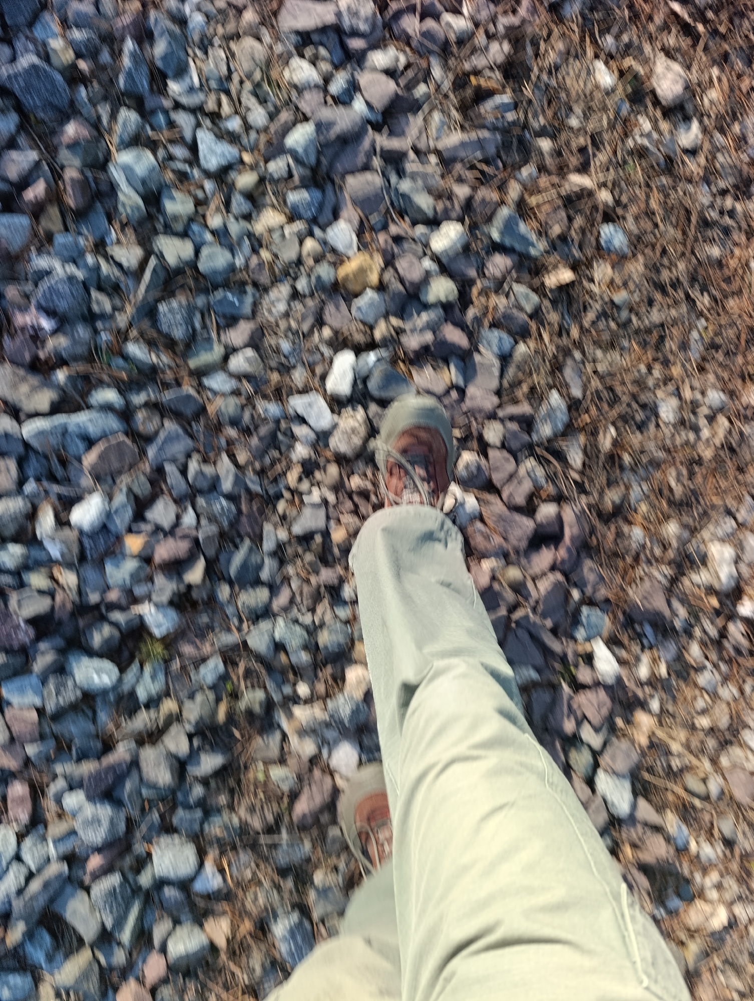 The image shows a first-person view of a person's leg and foot clad in light green pants and a brown shoe stepping on a rocky and dry grassy surface. The ground is composed of a mix of small rocks and…read more