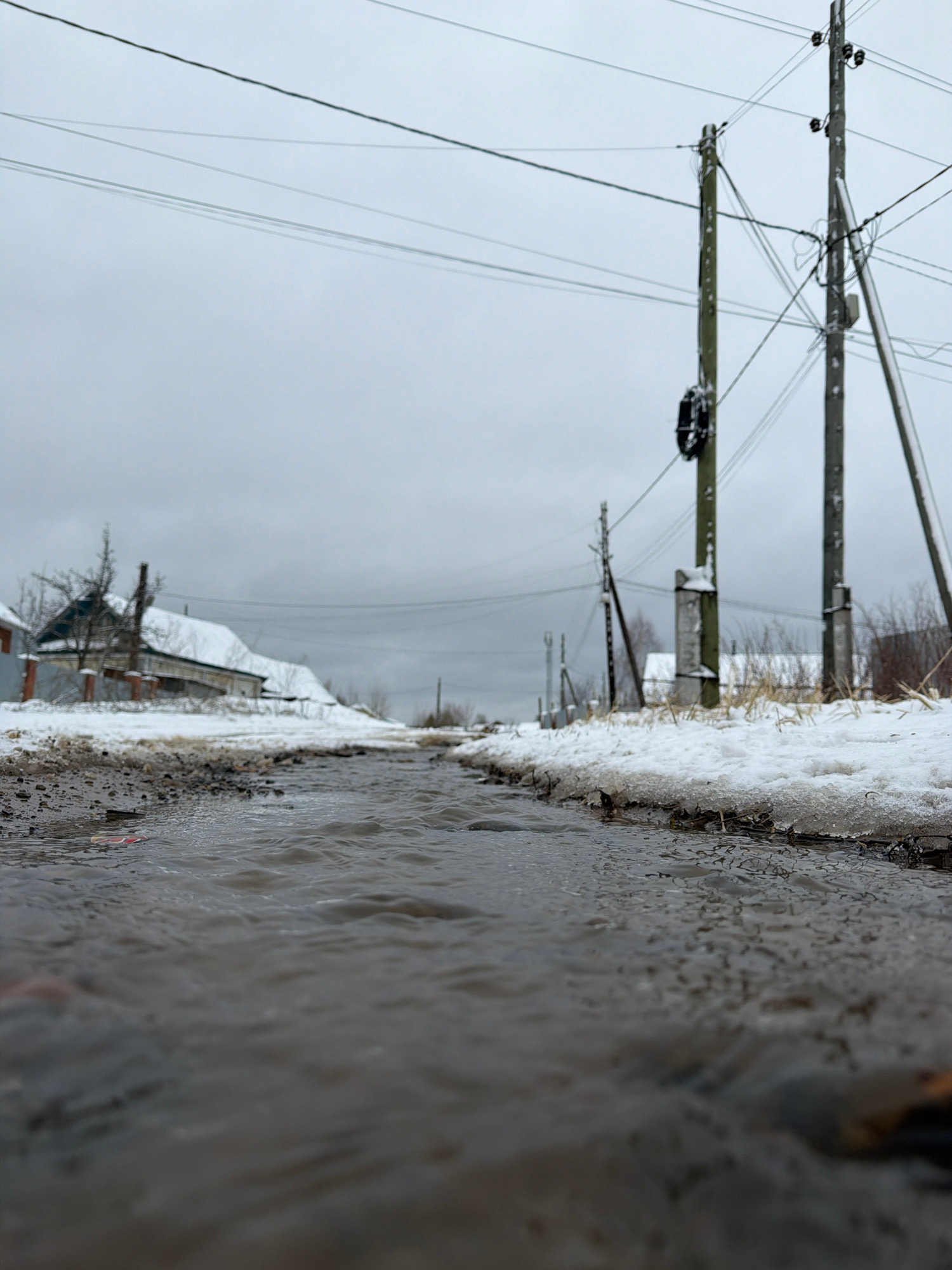 The image shows a street scene in what appears to be a residential area. The foreground consists of a wet road surface with accumulated slush. To the right of the road, snow covers the ground and adja…read more
