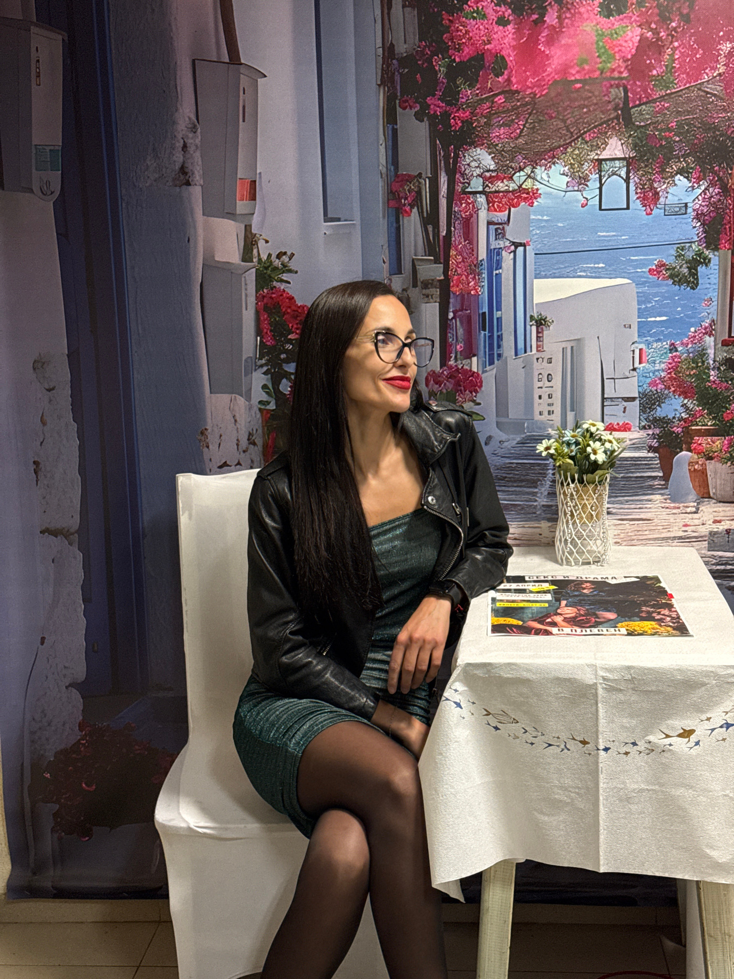 A long-haired woman with glasses and red lipstick sits at a table, wearing a black leather jacket and a green dress. The woman is likely in Pleven, Bulgaria, as indicated by the text on a poster on th…read more