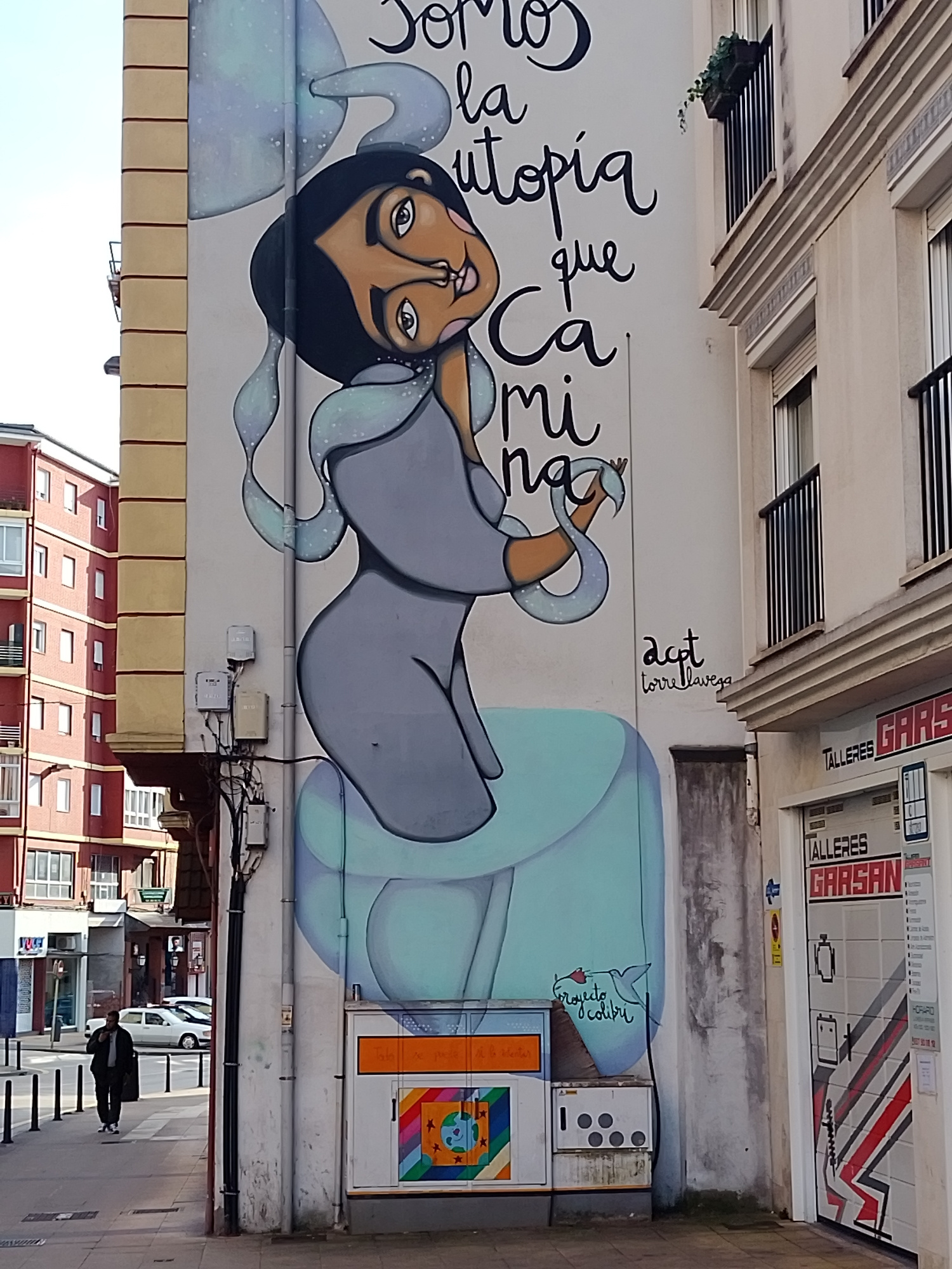 The photograph presents an urban scene in Torrelavega, Spain, featuring a mural that dominates the side of a building. The mural depicts a stylized woman in a grey garment, emerging from a pale blue,…read more