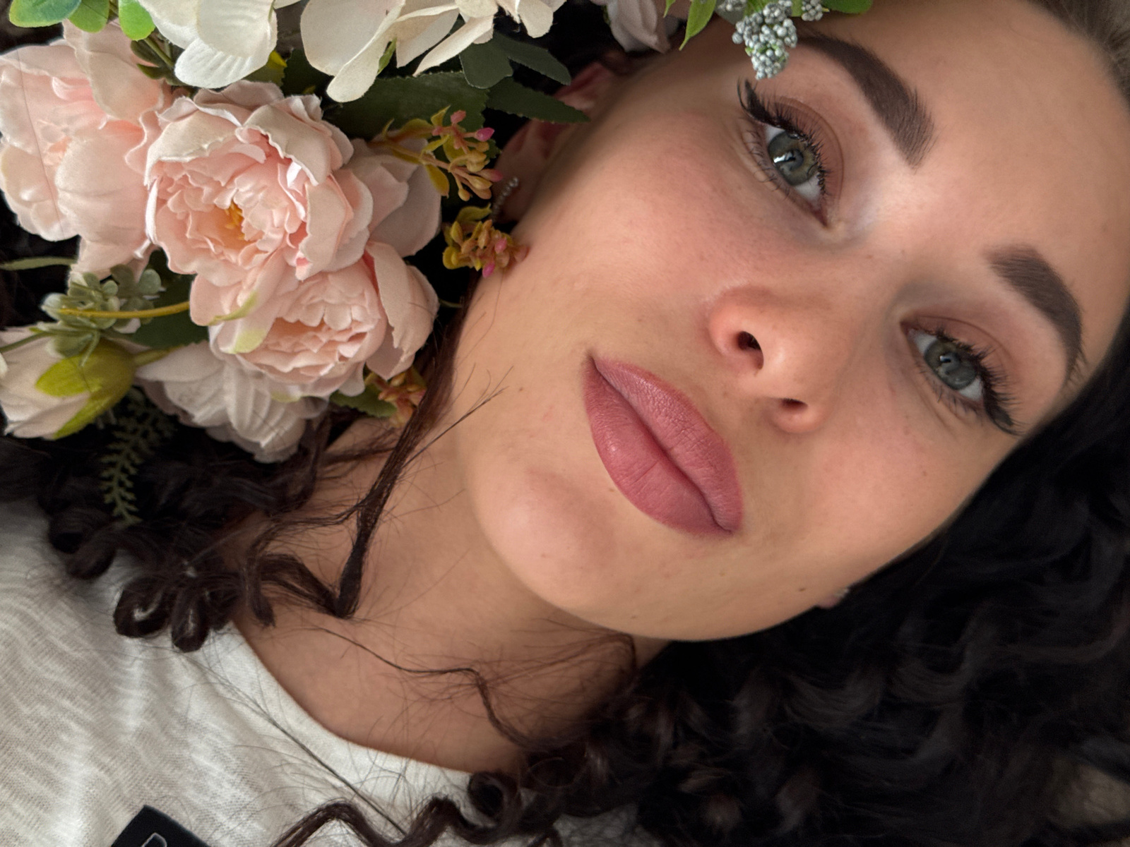 A close-up, tilted shot depicts a woman with dark, curly hair lying down among light pink and white flowers with green foliage. Her face is angled towards the camera, showcasing her fair skin, dark ey…read more
