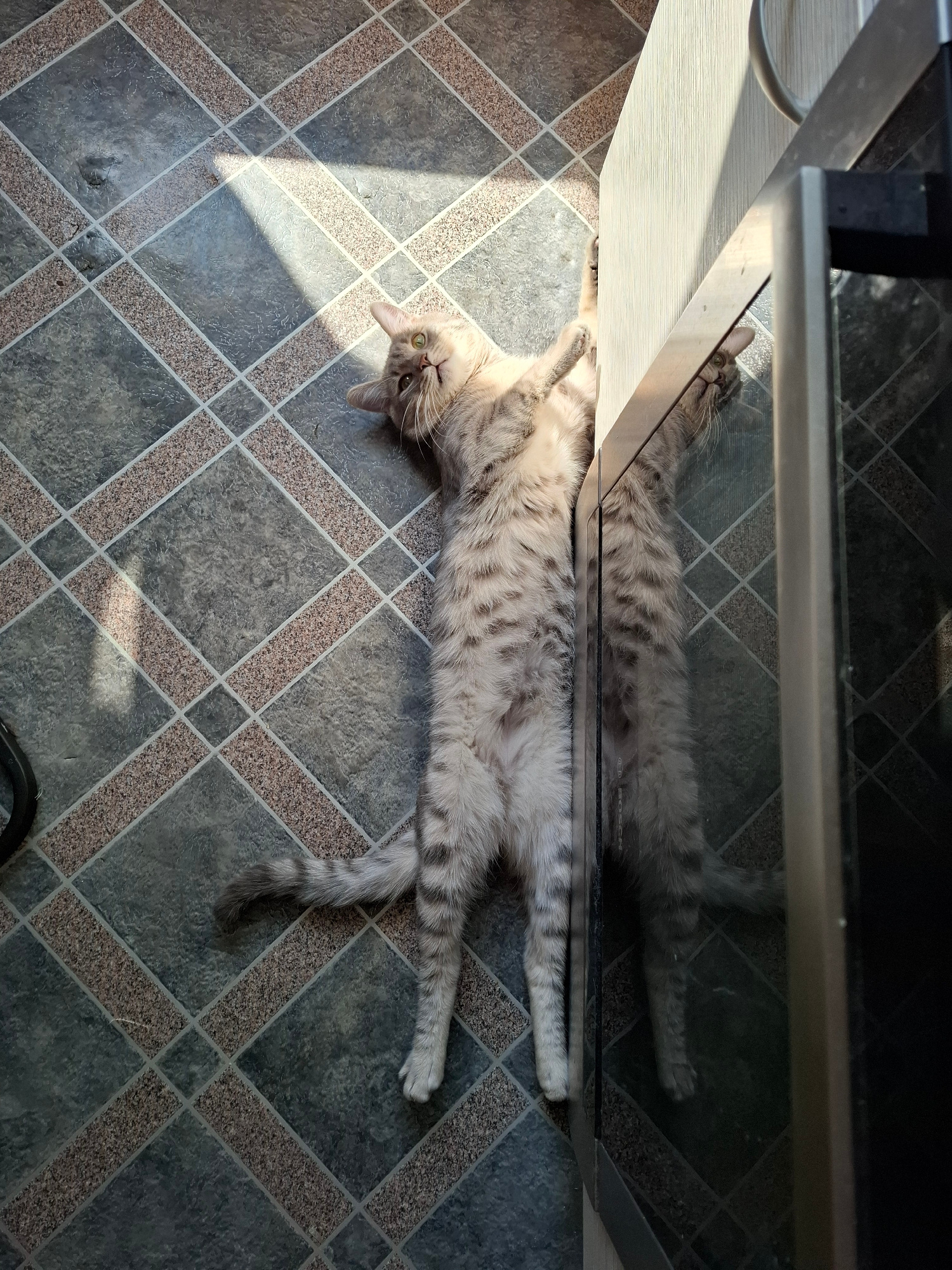 A grey tabby cat is lying on a tiled floor near the base of a reflective kitchen appliance. The cat is stretched out with its legs and tail extended, and its head is turned towards the viewer. The tilβ¦read more