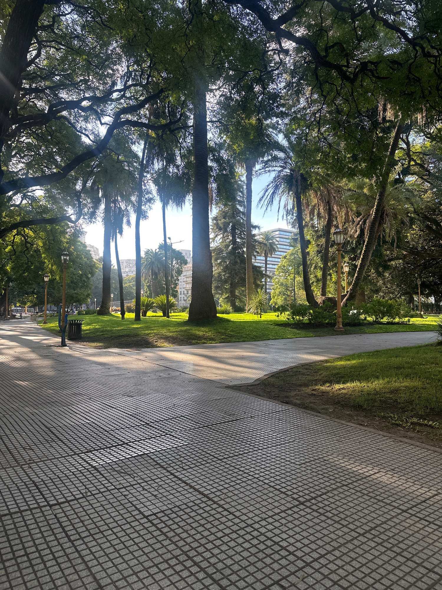 The image depicts a park scene in Buenos Aires, Argentina. A patterned gray stone pathway curves through the park. To the left of the path are various trees, including mature deciduous trees and palmβ¦read more