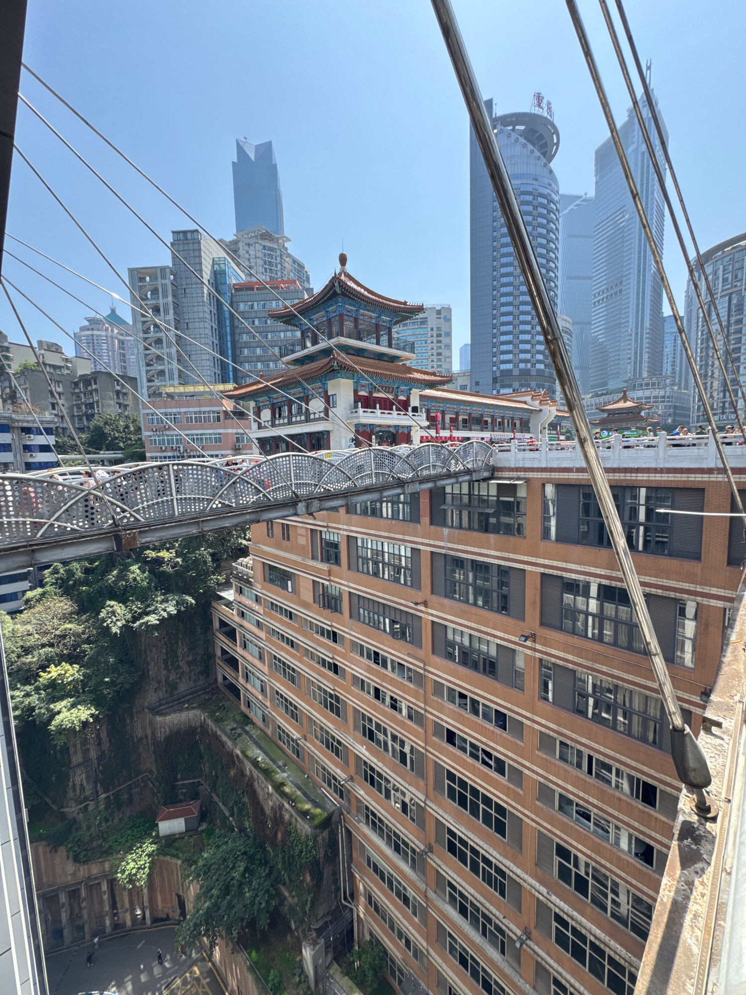 The image shows a view in Yuzhong District, China. A pedestrian bridge with a decorative lattice design spans across a green space between buildings. On one side of the bridge are modern skyscrapers,…read more